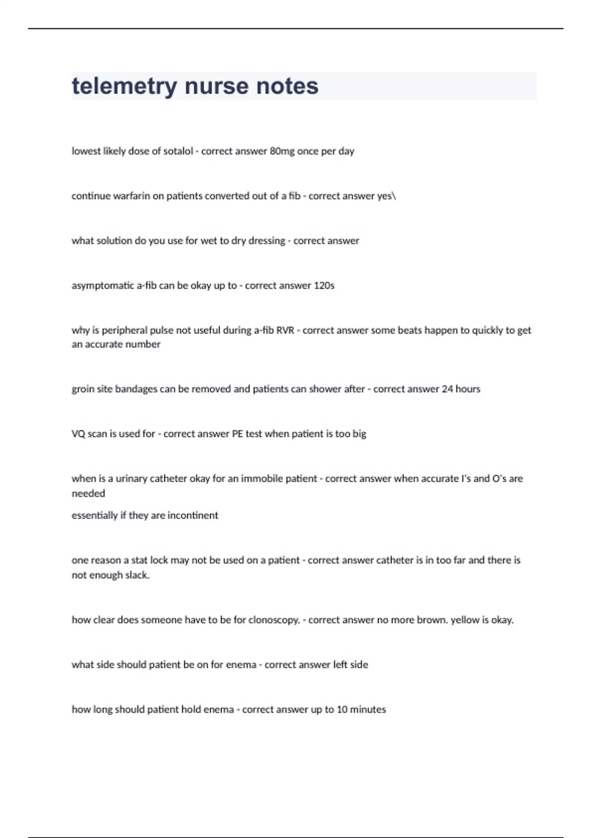 telemetry nurse noteslowest likely dose of sotalol - correct answer 80mg once per day continue warfarin on patients converted out of a fib - correct answer yes what solution do you use for wet to dry dressing - correct answer asymptomatic a-fib can be okay up to - correct answer 120s why is peripheral pulse not useful during a-fib RVR - correct answer some beats happen to quickly to get an accurate number groin site bandages can be removed and patients can shower after - correct answer 24 hours VQ scan is used for - correct answer PE test when patient is too big when is a urinary catheter okay for an immobile patient - correct answer when accurate I's and O's are needed essentially if they are incontinent one reason a stat lock may not be used on a patient - correct answer catheter is in too far and there is not enough slack. how clear does someone have to be for clonoscopy. - correct answer no more brown. yellow is okay. what side should patient be on for enema - correct answer left side how long should patient hold enema - correct answer up to 10 minutes best place for patient to empty enema - correct answer bed pan bowel preps are sometimes split in to tow halves - correct answer it is normal to have just one sheet to sign for an afib ablation - correct answer sometimes fluids are not DC'd in the MAR following an ablation, however they might be DC'd under - correct answer post op orders and as saline lock consider letting patients take their own eye drops - correct answer do we send meds to pharmacy from covid rooms? - correct answer no patients recommended SNF can refuse and get home health - correct answer truwe would they give xarelto or hold it prior to an ablation - correct answer hold one way to find important new orders in cerner on admission - correct answer ignore orders by system and focus on orders by actual doctor US of this would be good for someone who fainted? - correct answer carotids is it healthy if the EP study puts the patient into VF/VT - correct answer no, this means they are at risk of cardiac arrest. saline water is - correct answer in rx station