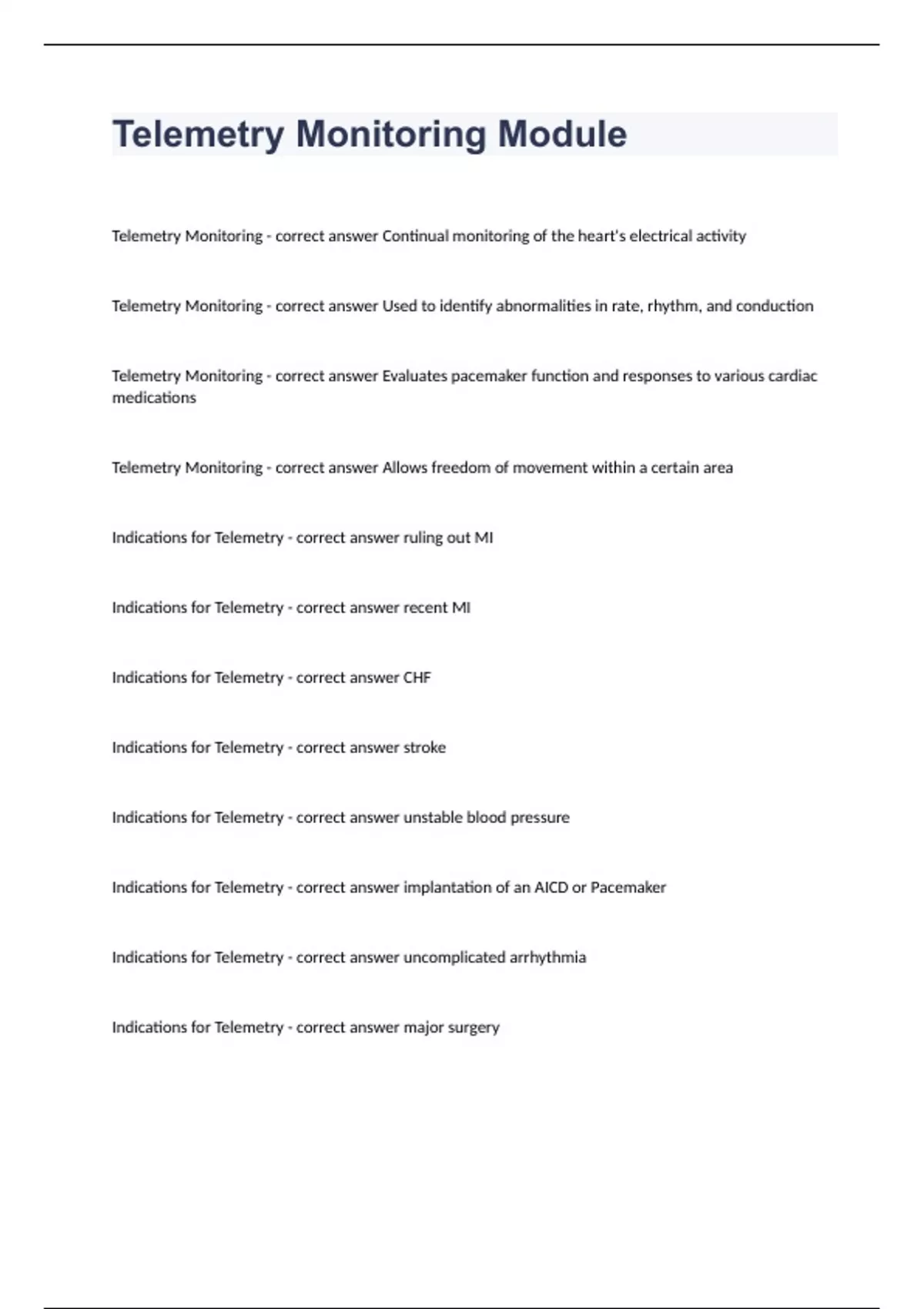 Telemetry Monitoring ModuleTelemetry Monitoring - correct answer Continual monitoring of the heart's electrical activity Telemetry Monitoring - correct answer Used to identify abnormalities in rate, rhythm, and conduction Telemetry Monitoring - correct answer Evaluates pacemaker function and responses to various cardiac medications Telemetry Monitoring - correct answer Allows freedom of movement within a certain area Indications for Telemetry - correct answer ruling out MI Indications for Telemetry - correct answer recent MI Indications for Telemetry - correct answer CHF Indications for Telemetry - correct answer stroke Indications for Telemetry - correct answer unstable blood pressure Indications for Telemetry - correct answer implantation of an AICD or Pacemaker Indications for Telemetry - correct answer uncomplicated arrhythmia Indications for Telemetry - correct answer major surgery Nursing Role in Telemetry - correct answer Ensure that electrodes are properly placed and in contact with skin Nursing Role in Telemetry - correct answer Interpret cardiac rhythms and anticipate effects on overall condition Nursing Role in Telemetry - correct answer Document cardiac rhythm at least every 4 hours Nursing Role in Telemetry - correct answer Communicate with patients Atrial Fibrillation (A-Fib) - correct answer an irregular and often very fast heart rate originating from abnormal conduction in the atria Supraventricular Tachycardia (SVT) - correct answer impulses travel back up to the atria from the ventricles and go in a circle, rather than down from the atria in one direction makes the heart beat faster Ventricular tachycardia (V-tach) - correct answer A life-threatening heart rhythm in which there is very rapid contraction of the ventricles, and the heart does not pump blood at all heart block - correct answer electrical impulses cannot travel normally from the SA node to the Purkinje fibers and heart rate slows or stops Ventricular fibrillation (V-fib) - correct answer the rapid, irregular, and useless contractions of the ventricles, fatal Supplies to Prep for Telemetry Placement - correct answer alcohol prep exfoliation paper 5 ekg electrodes right arm lead color - correct answer white