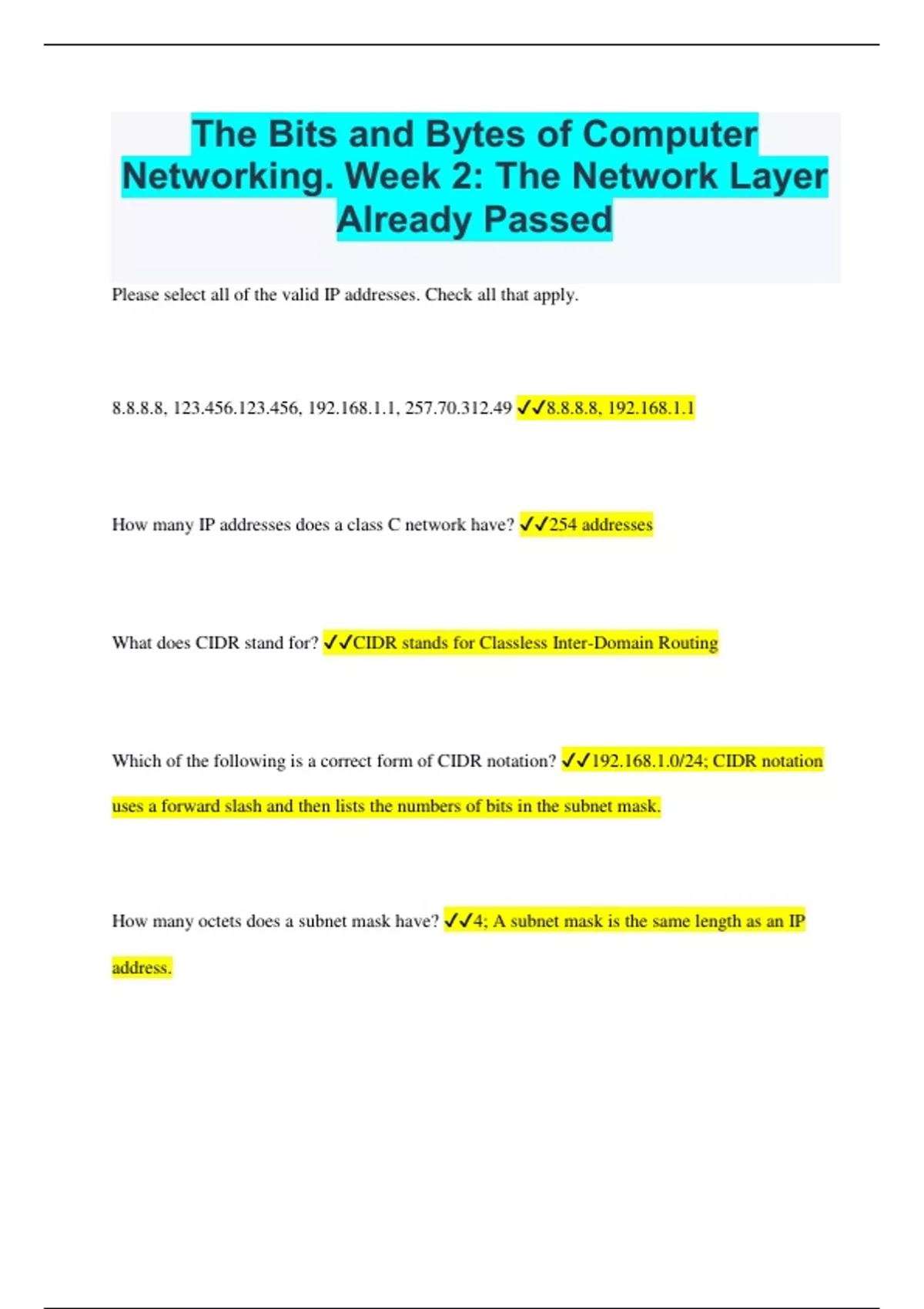 Which of the following is a correct form of CIDR notation? ✔✔192.168.1.0/24; CIDR notation