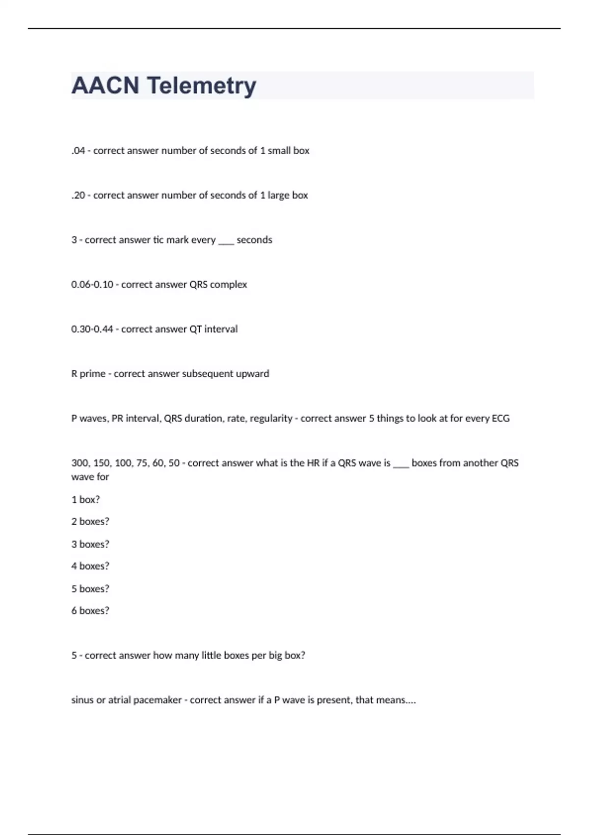 AACN Telemetry.04 - correct answer number of seconds of 1 small box .20 - correct answer number of seconds of 1 large box 3 - correct answer tic mark every ___ seconds 0.06-0.10 - correct answer QRS complex 0.30-0.44 - correct answer QT interval R prime - correct answer subsequent upward P waves, PR interval, QRS duration, rate, regularity - correct answer 5 things to look at for every ECG 300, 150, 100, 75, 60, 50 - correct answer what is the HR if a QRS wave is ___ boxes from another QRS wave for 1 box? 2 boxes? 3 boxes? 4 boxes? 5 boxes? 6 boxes? 5 - correct answer how many little boxes per big box? sinus or atrial pacemaker - correct answer if a P wave is present, that means.... junctional or ventricular pacemaker - correct answer if a P wave is absent that means.... sinus or atrial - correct answer if the P wave is normal, same axis as QRS it means... retrograde from AV or ventricle - correct answer if the P wave is not normal, different axis as QRS it means... 1 pacemaker - correct answer if all P waves are alike that means.. multiple automaticity foci - correct answer if the P waves are not alike that means... sinus or atrial pacemaker - correct answer it there is a P wave before each QRS that means... junctional or ventricular pacemaker - correct answer if there is not a P wave before each QRS that menas... no AV dissociation (no 2nd or 3rd degree AV block) - correct answer if ther is a QRS after each P wave that means.... AV dissociation (2nd or 3rd degree AV block) - correct answer if there is not a QRS after each P wave that means.... no AV block - correct answer if the PR interval is normal, that means.... 1st degree AV block - correct answer if the PR interval is consistently increased.... 2nd degree AV block type I (Wenckebach) - correct answer if the PR interval progressively increases, that means....