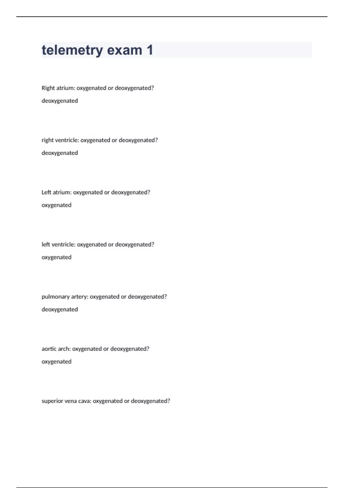 telemetry exam 1Right atrium: oxygenated or deoxygenated? deoxygenated right ventricle: oxygenated or deoxygenated? deoxygenated Left atrium: oxygenated or deoxygenated? oxygenated left ventricle: oxygenated or deoxygenated? oxygenated pulmonary artery: oxygenated or deoxygenated? deoxygenated aortic arch: oxygenated or deoxygenated? oxygenated superior vena cava: oxygenated or deoxygenated? oxygenated inferior vena cava: oxygenated or deoxygenated? deoxygenated pulmonary vein: oxygenated or deoxygenated? oxygenated atrioventricular valves mitral and tricuspid what heart sound do the atrioventricular valves produce? makes S1 or "lub" semi-lunar valves pulmonary and aortic what heart sounds do the semi-lunar valves produce? S2 or "DUB" automaticity ability to make an impulse excitability ability to respond to an impulse conductivity ability to transmit energy from one cell to another what sets the rate for the heart and what is normal rate? determined by the fastest firing node SA node: 60-100 what node fires at a rate of 40-60? AV node what "pacemaker" fires the slowest? what are the norms for this node? ventricular: 30-40 identify 5 stage of action potential 1. rapid depolarization 2. early repolarization 3. plateau phase 4. rapid repolarization 5. resting phase