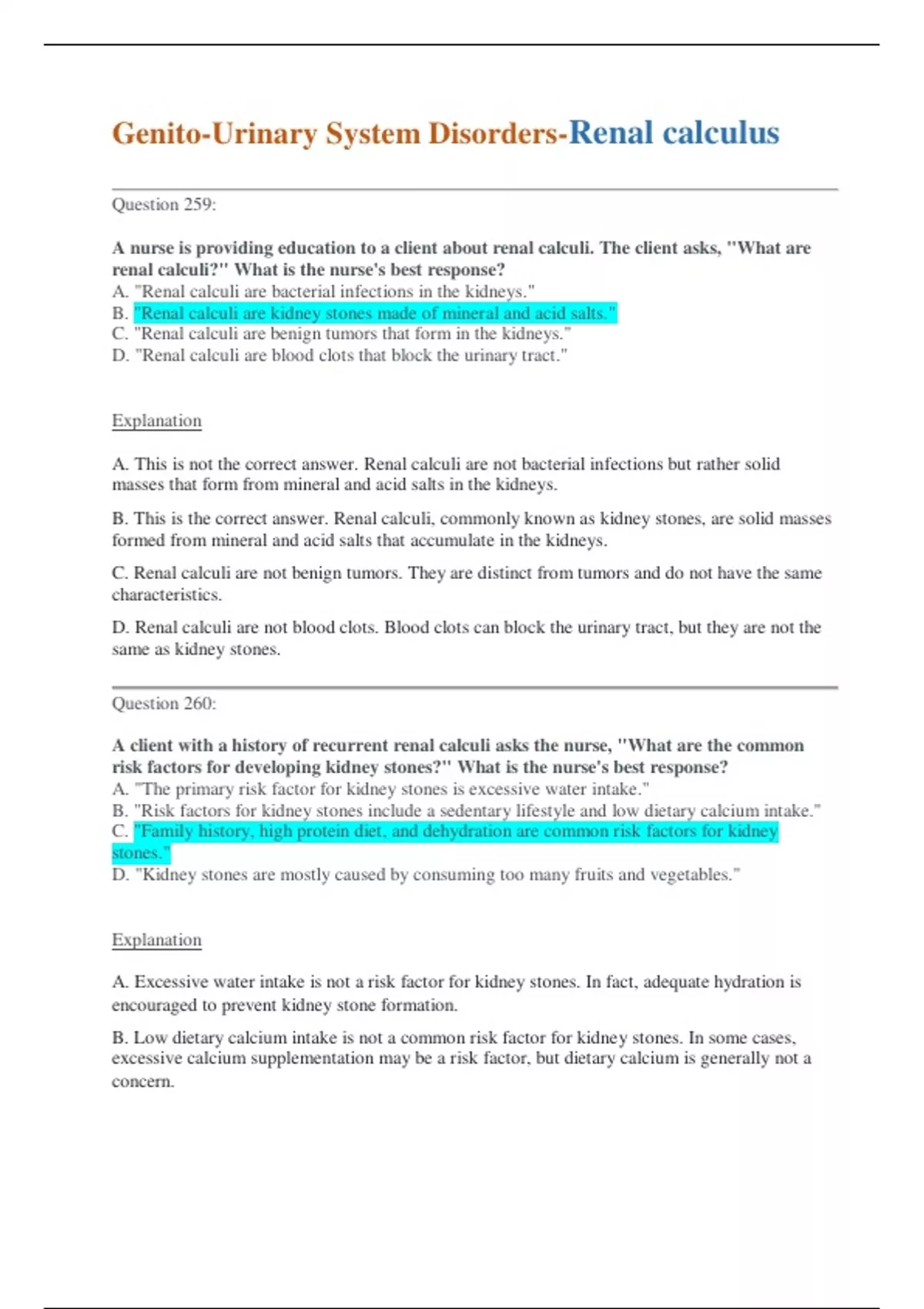 A nurse is providing education to a client about renal calculi. The client asks, "What are renal calculi?" What is the nurse's best response? A. "Renal calculi are bacterial infections in the kidneys." B. "Renal calculi are kidney stones made of mineral and acid salts." C. "Renal calculi are benign tumors that form in the kidneys." D. "Renal calculi are blood clots that block the urinary tract." Explanation A. This is not the correct answer. Renal calculi are not bacterial infections but rather solid masses that form from mineral and acid salts in the kidneys. B. This is the correct answer. Renal calculi, commonly known as kidney stones, are solid masses formed from mineral and acid salts that accumulate in the kidneys. C. Renal calculi are not benign tumors. They are distinct from tumors and do not have the same characteristics. D. Renal calculi are not blood clots. Blood clots can block the urinary tract, but they are not the same as kidney stones.