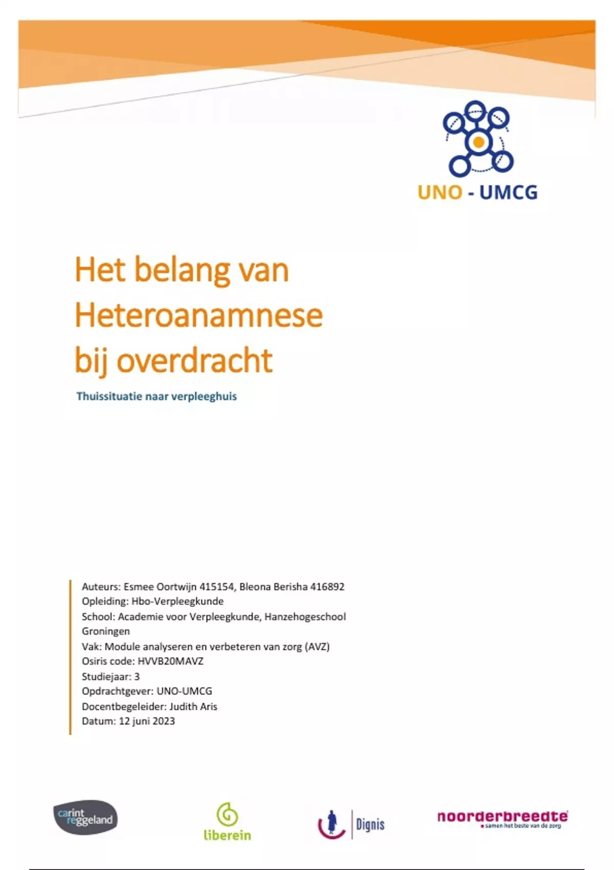 Allereerst willen wij graag UNO-UMCG bedanken voor de uitstekende samenwerking. Hun