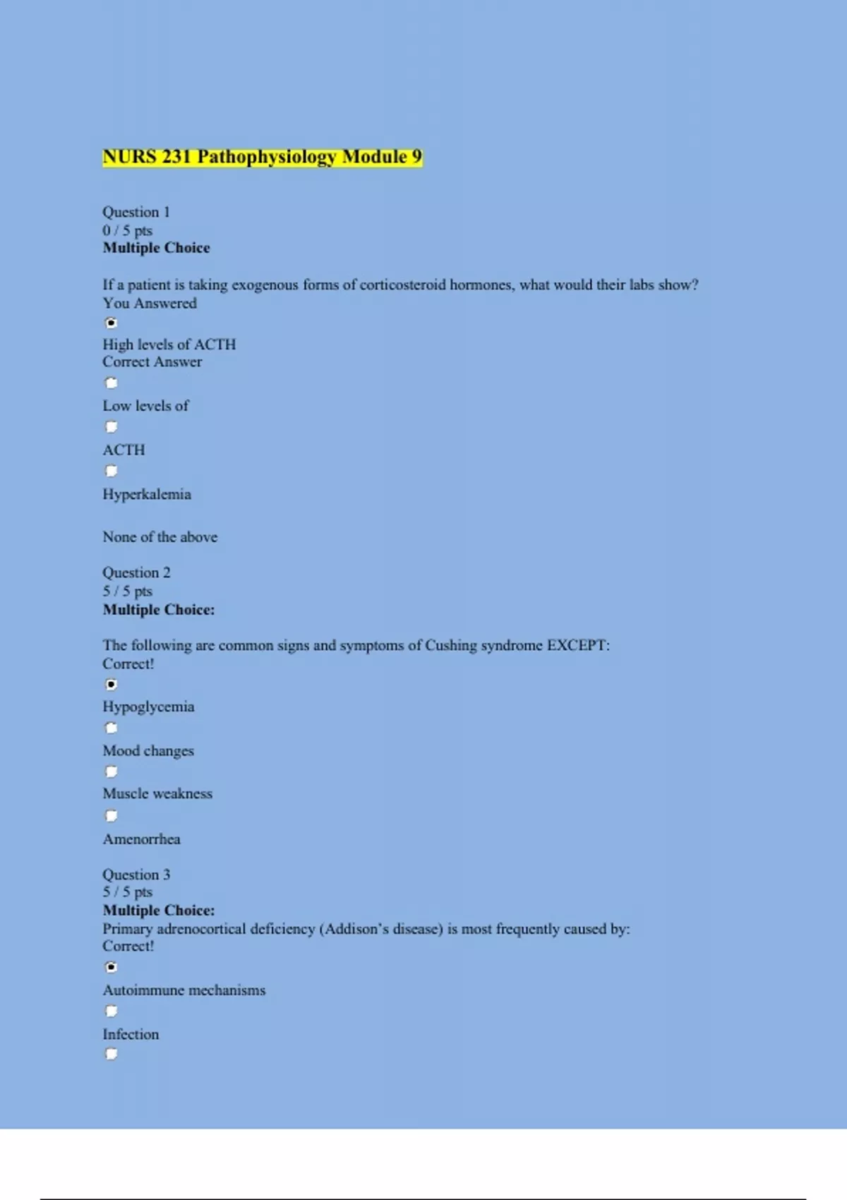 NURS 231 Pathophysiology Module 9 Exam Q&A PORTAGE LEARNING