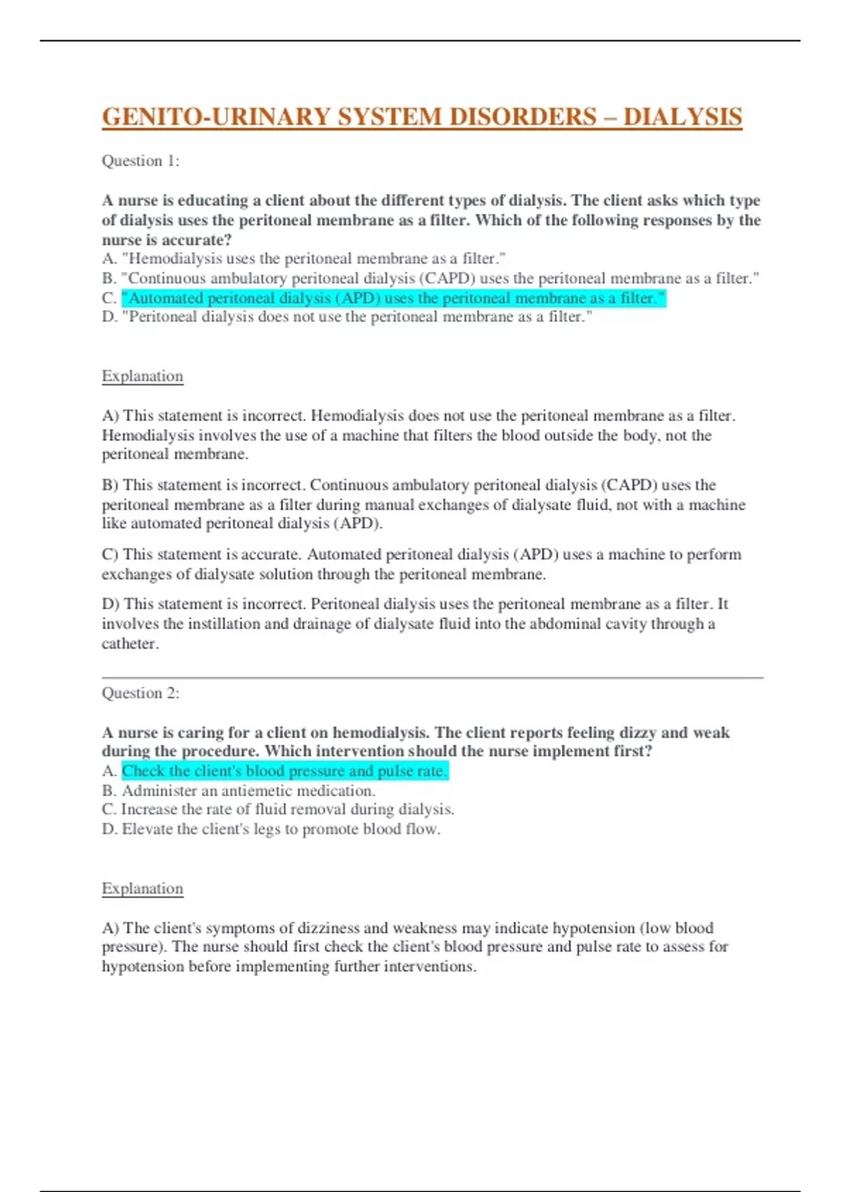 A nurse is educating a client about the different types of dialysis. The client asks which type of dialysis uses the peritoneal membrane as a filter. Which of the following responses by the nurse is accurate? A. "Hemodialysis uses the peritoneal membrane as a filter." B. "Continuous ambulatory peritoneal dialysis (CAPD) uses the peritoneal membrane as a filter." C. "Automated peritoneal dialysis (APD) uses the peritoneal membrane as a filter." D. "Peritoneal dialysis does not use the peritoneal membrane as a filter." Explanation A) This statement is incorrect. Hemodialysis does not use the peritoneal membrane as a filter. Hemodialysis involves the use of a machine that filters the blood outside the body, not the peritoneal membrane. B) This statement is incorrect. Continuous ambulatory peritoneal dialysis (CAPD) uses the peritoneal membrane as a filter during manual exchanges of dialysate fluid, not with a machine like automated peritoneal dialysis (APD). C) This statement is accurate. Automated peritoneal dialysis (APD) uses a machine to perform exchanges of dialysate solution through the peritoneal membrane. D) This statement is incorrect. Peritoneal dialysis uses the peritoneal membrane as a filter. It involves the instillation and drainage of dialysate fluid into the abdominal cavity through a catheter.