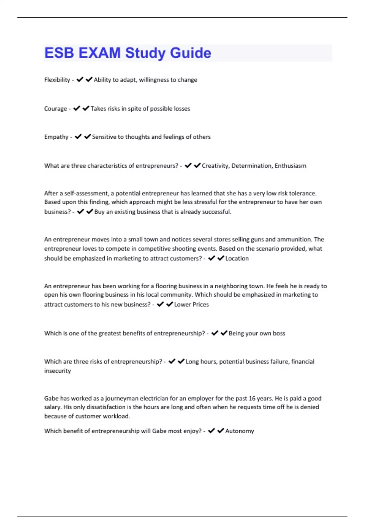 Flexibility - Ability to adapt, willingness to change Courage - Takes risks in spite of possible losses Empathy - Sensitive to thoughts and feelings of others What are three characteristics of entrepreneurs? - Creativity, Determination, Enthusiasm After a self-assessment, a potential entrepreneur has learned that she has a very low risk tolerance. Based upon this finding, which approach might be less stressful for the entrepreneur to have her own business? - Buy an existing business that is already successful. An entrepreneur moves into a small town and notices several stores selling guns and ammunition. The entrepreneur loves to compete in competitive shooting events. Based on the scenario provided, what should be emphasized in marketing to attract customers? - Location An entrepreneur has been working for a flooring business in a neighboring town. He feels he is ready to open his own flooring business in his local community. Which should be emphasized in marketing to attract customers to his new business? - Lower Prices Which is one of the greatest benefits of entrepreneurship? - Being your own boss Which are three risks of entrepreneurship? - Long hours, potential business failure, financial insecurity Gabe has worked as a journeyman electrician for an employer for the past 16 years. He is paid a good salary. His only dissatisfaction is the hours are long and often when he requests time off he is denied because of customer workload. Which benefit of entrepreneurship will Gabe most enjoy? - AutonomyWhat is a primary benefit of starting a new business without purchasing a franchise or buying an existing business? - Developing your own rules A mechanic just graduated from motorcycle repair school and wants to start a business because there is a lack of motorcycle repair shops in the local town. Given the facts provided, which opportunity would be the best choice for the motorcycle mechanic to open a business? - Start a new business and invest $50,000 in modern diagnostic tools. An entrepreneur who has a hobby in leathercraft wants to turn it into a business. She wants to sell purses, belts, and other leathercrafts from her home. Which opportunity for starting a leathercraft business would have the highest probability of success? - Build an online storefront Based upon the education and skills gained from the years of vocational training as an auto mechanic, as well as having grown up in a family of entrepreneurs, a young adult decides to open an auto mechanic shop. Which customer group will this new auto mechanic business support? -Businesses The owner of a pizza delivery business is seeking new customers. The owner has identified a group of potential customers that have moved into some new housing within reaches of his drivers. Which method of segmentation is the owner using? - Geographic