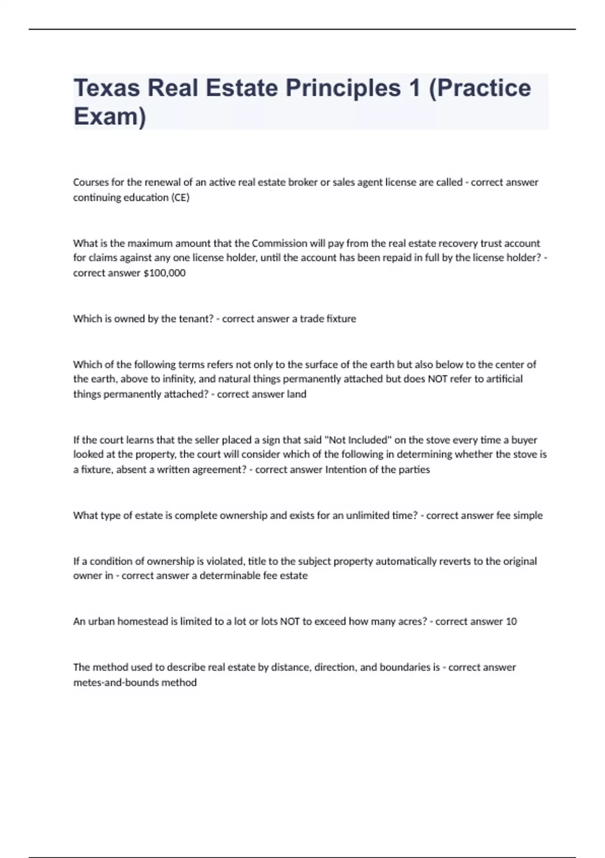 Texas Real Estate Principles 1 (Practice Exam) Courses for the renewal of an active real estate broker or sales agent license are called - correct answer continuing education (CE) What is the maximum amount that the Commission will pay from the real estate recovery trust account for claims against any one license holder, until the account has been repaid in full by the license holder? - correct answer $100,000 Which is owned by the tenant? - correct answer a trade fixture Which of the following terms refers not only to the surface of the earth but also below to the center of the earth, above to infinity, and natural things permanently attached but does NOT refer to artificial things permanently attached? - correct answer land If the court learns that the seller placed a sign that said "Not Included" on the stove every time a buyer looked at the property, the court will consider which of the following in determining whether the stove is a fixture, absent a written agreement? - correct answer Intention of the parties What type of estate is complete ownership and exists for an unlimited time? - correct answer fee simple If a condition of ownership is violated, title to the subject property automatically reverts to the original owner in - correct answer a determinable fee estate An urban homestead is limited to a lot or lots NOT to exceed how many acres? - correct answer 10 The method used to describe real estate by distance, direction, and boundaries is - correct answer metes-and-bounds method Which equals one square mile or 640 acres? - correct answer section Under the federal Fair Housing Act, real estate organizations, such as multiple listing services, may NOT do which because someone is in a protected group? - correct answer refuse membership or put conditions on participation Which aspect of the Canons of Professional Ethics and Conduct requires the broker or sales agent to be informed on market conditions and national, state, and local developments affecting the real estate business? - correct answer competency. A complaint of discrimination brought under the Texas Fair Housing Act can be filed with the U.S. Department of Housing and Urban Development or with - correct answer the Texas Workforce Commission Civil Rights Division An aggrieved person who believes illegal discrimination has occurred may file a complaint within what time frame following the alleged discriminatory act? - correct answer ONE YEAR Appurtenant easement rights transfer with - correct answer the dominant tenement An owner sells part of his land that has no access to a public road but does have access over his remaining land. This creates an easement by - correct answer necessity When there are two or more liens on a property, the order in which the liens will be satisfied when the property is sold will be determined by - correct answer the priority of the liens Which of the following may be a natural object, such as a tree or a boulder, or an artificial object, such as a steel rod or a stake driven into the ground? - correct answer Monument It is unlawful for a person to act in the capacity of or claim to be a real estate broker without first - correct answer obtaining a license from the Texas Real Estate Commission A real estate broker's license is NOT required of persons who - correct answer advertise and lease their own properties