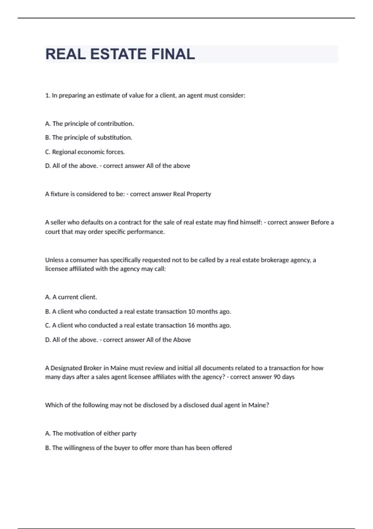 REAL ESTATE FINAL1. In preparing an estimate of value for a client, an agent must consider: A. The principle of contribution. B. The principle of substitution. C. Regional economic forces. D. All of the above. - correct answer All of the above A fixture is considered to be: - correct answer Real Property A seller who defaults on a contract for the sale of real estate may find himself: - correct answer Before a court that may order specific performance. Unless a consumer has specifically requested not to be called by a real estate brokerage agency, a licensee affiliated with the agency may call: A. A current client. B. A client who conducted a real estate transaction 10 months ago. C. A client who conducted a real estate transaction 16 months ago. D. All of the above. - correct answer All of the Above A Designated Broker in Maine must review and initial all documents related to a transaction for how many days after a sales agent licensee affiliates with the agency? - correct answer 90 days Which of the following may not be disclosed by a disclosed dual agent in Maine? A. The motivation of either party B. The willingness of the buyer to offer more than has been offered C. The willingness of the seller to accept less than has been offered D. All of the above - correct answer All of the above Jay's driveway crosses his neighbor's property. This right is recorded in the registry of deeds and will transfer to the new owner when Jay sells his property. Jay has a(n): - correct answer Easement Appurtenant If one party fails to meet a contingency of the contract, the contract is: - correct answer Voidable When a buyer decides to purchase the less expensive of two similar properties, he is providing an example of the valuation principle of: - correct answer Substitution The secondary mortgage market is important because it: - correct answer Makes money available for home purchases On the day before closing, the buyer agent and her client visit the property to conduct what is known as a: - correct answer Walk-through Which of the following is NOT part of the definition of Fair Market Value? A. Payment is made in money B. Exposure to the market for a reasonable period of time C. Financing is customary and usual for similar properties D. Sellers are forced to sell due to eminent domain - correct answer Sellers are forced to sell due to eminent domain A landlord may properly evict a tenant who is behind in his or her rent by: - correct answer Commencing eviction proceedings. According to Mane Law & Rule, the property disclosure form is to be delivered to a buyer: - correct answer Prior to or during the preparation of an offer.