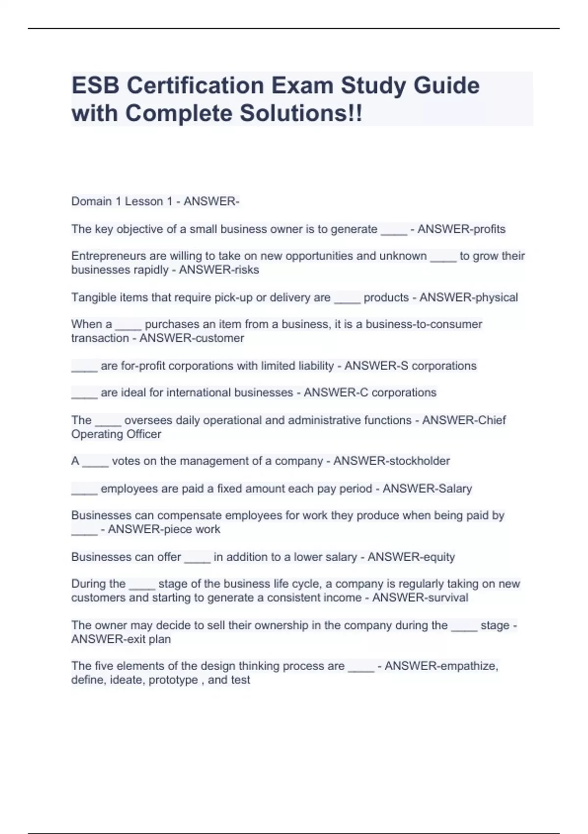 Domain 1 Lesson 1 - ANSWER- The key objective of a small business owner is to generate ____ - ANSWER-profits Entrepreneurs are willing to take on new opportunities and unknown ____ to grow their businesses rapidly - ANSWER-risks Tangible items that require pick-up or delivery are ____ products - ANSWER-physical When a ____ purchases an item from a business, it is a business-to-consumer transaction - ANSWER-customer ____ are for-profit corporations with limited liability - ANSWER-S corporations ____ are ideal for international businesses - ANSWER-C corporations The ____ oversees daily operational and administrative functions - ANSWER-Chief Operating Officer A ____ votes on the management of a company - ANSWER-stockholder ____ employees are paid a fixed amount each pay period - ANSWER-Salary Businesses can compensate employees for work they produce when being paid by ____ - ANSWER-piece work Businesses can offer ____ in addition to a lower salary - ANSWER-equity During the ____ stage of the business life cycle, a company is regularly taking on new customers and starting to generate a consistent income - ANSWER-survival The owner may decide to sell their ownership in the company during the ____ stage - ANSWER-exit plan The five elements of the design thinking process are ____ - ANSWER-empathize, define, ideate, prototype , and test ____ allows one to see and experience a customer's perspective - ANSWER-Empathy The design team creates multiple inexpensive versions of a product, known as ____ - ANSWER-Minimum Viable Products Name benefits of a franchise - ANSWER-less risk involved, tested operational processes, or recognized brands No ownership, no US federal taxes - ANSWER-Non-profit Best for international business even with being double-taxed - ANSWER-C corporation Easy to create but comes with unlimited liability - ANSWER-Sole proprietorship Lower tax rate that prevents the company from being double-taxed - ANSWER-S corporation Ideal for a single owner seeking low risk - ANSWER-LLC (limited liability company) Shared financial backing - ANSWER-Partnership Creates the company - ANSWER-Founder Oversees company finances - ANSWER-CFO Owns stock in the company - ANSWER-Stockholder Reports to the board of directors - ANSWER-CEO Oversees daily operational and administrative functions Stakeholder Has a vested interest in the success of the company - ANSWER-COO Has a vested interest in the success of the company - ANSWER-Stakeholder Non-cash compensation - ANSWER-Equity Set rate of pay for hours worked - ANSWER-Hourly Usually found in sales roles - ANSWER-Commission Set amount of pay in a given period - ANSWER-Salary List the correct order of the business life cycle stages - ANSWER-Existence, Survival, Success, Take-off, Resource maturity, Pivot or persist, Exit plan