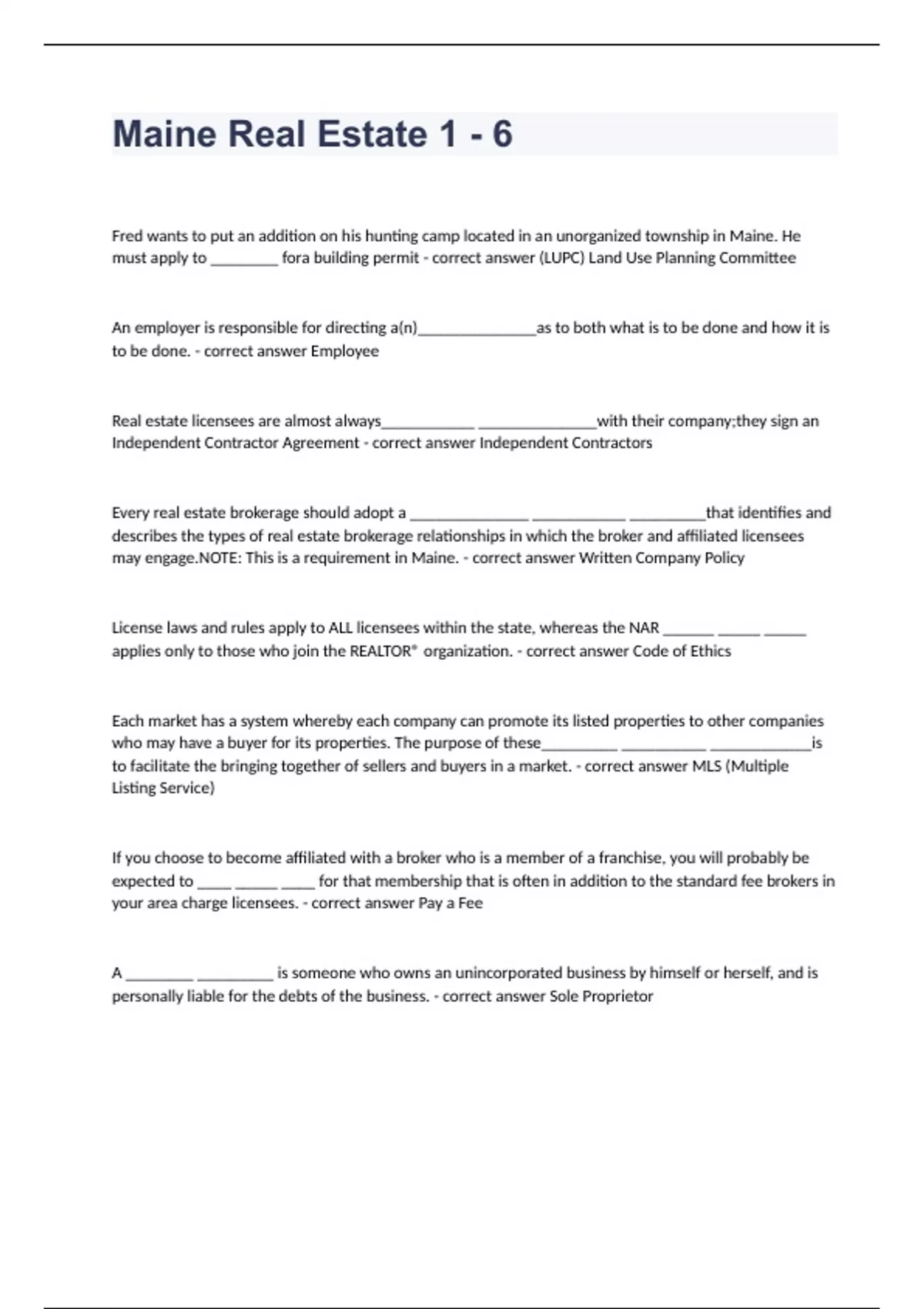 Maine Real Estate 1 - 6 questions with verified solutions 2023/2024