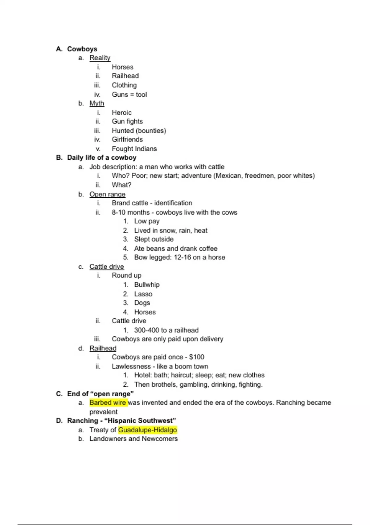 These typed-out class notes go over the history of cowboys in America. From distinguishing the expectations and realities of cowboys to the daily life of a cowboy to the end of the cowboy era, and much more. There's also information about the Mexican influence of cowboys and what it's like to live on the Great Plains. Other important information includes sodbusters, bonanza farms, wheat belts, Morrill college land grant act, and the Homestead act of 1862.