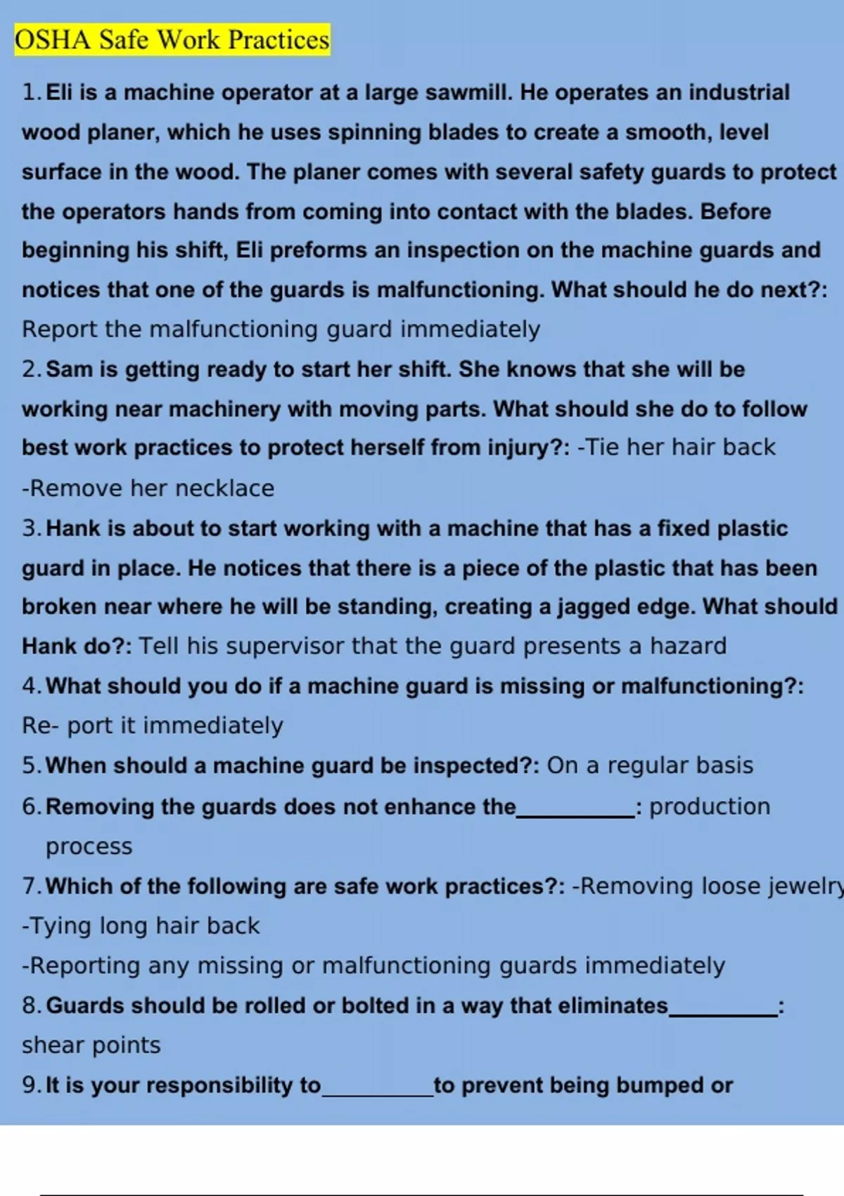 OSHA- Safe Work Practices Questions with 100% Correct Answers | Verified | Updated