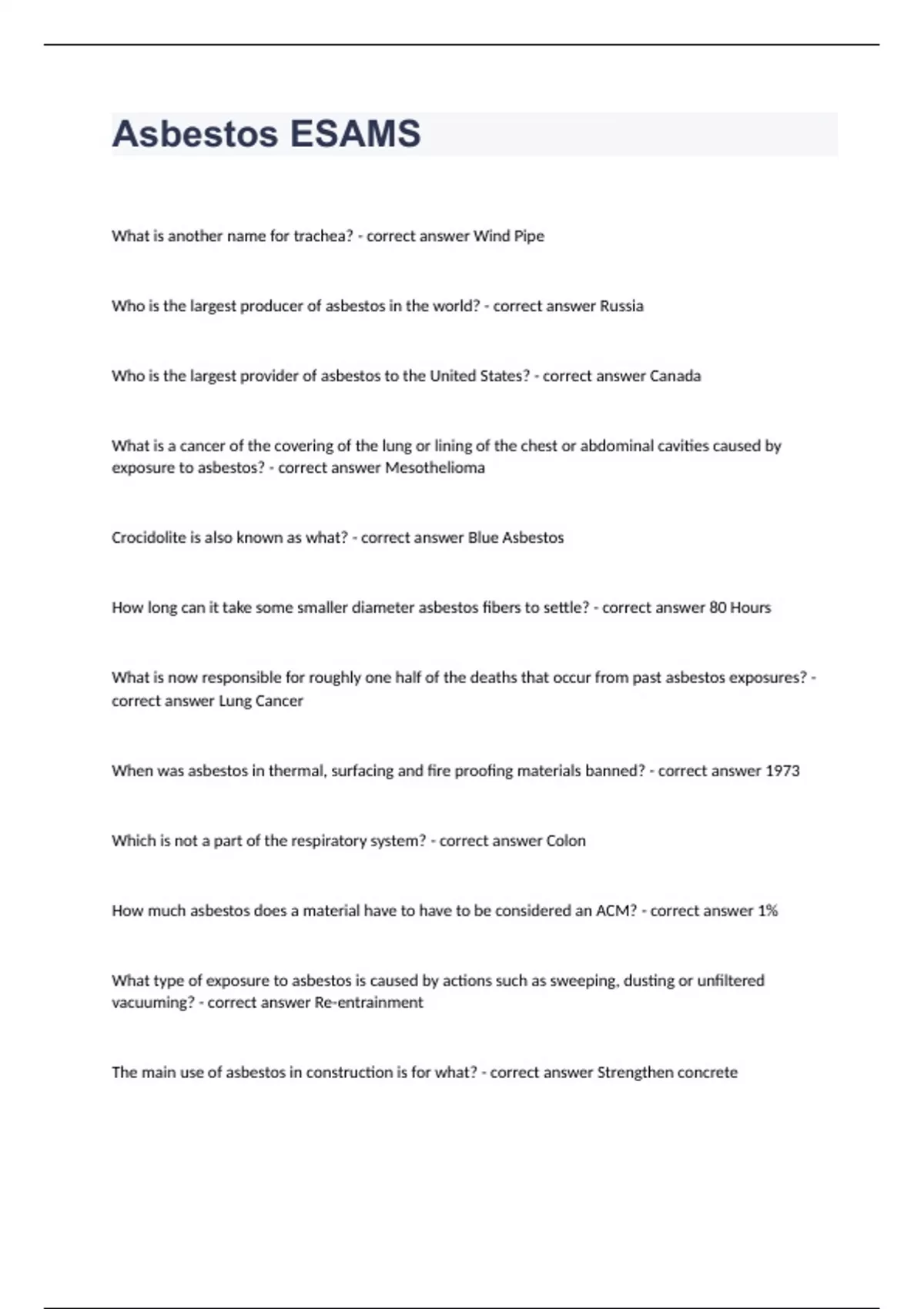 Asbestos ESAMSWhat is another name for trachea? - correct answer Wind Pipe Who is the largest producer of asbestos in the world? - correct answer Russia Who is the largest provider of asbestos to the United States? - correct answer Canada What is a cancer of the covering of the lung or lining of the chest or abdominal cavities caused by exposure to asbestos? - correct answer Mesothelioma Crocidolite is also known as what? - correct answer Blue Asbestos How long can it take some smaller diameter asbestos fibers to settle? - correct answer 80 Hours What is now responsible for roughly one half of the deaths that occur from past asbestos exposures? - correct answer Lung Cancer When was asbestos in thermal, surfacing and fire proofing materials banned? - correct answer 1973 Which is not a part of the respiratory system? - correct answer Colon How much asbestos does a material have to have to be considered an ACM? - correct answer 1% What type of exposure to asbestos is caused by actions such as sweeping, dusting or unfiltered vacuuming? - correct answer Re-entrainment The main use of asbestos in construction is for what? - correct answer Strengthen concrete What makes an asbestos material non-friable? - correct answer Products where the asbestos is bound in a tight matrix and will not easily shed asbestos fibbers under normal day to day use What chapter in OPNAVINST 5100.23 (series) covers asbestos? - correct answer 17 What is a chronic disease in which lungs become scarred as a result of a biological reaction to the inhalation of asbestos fibers? - correct answer Asbestosis Why is asbestos so inexpensive to use? - correct answer Asbestos only requires minor refining prior to its use in manufacturing. Which item has a high friability characteristic? - correct answer spray insulation How long does it take asbestos fibers to break down in the environment? - correct answer A very long time, they are practically indestructible How much more likely does a person who works with asbestos and also smokes have in developing lung cancer? - correct answer 90 times What are cilia? - correct answer hairlike protrusions on cells lining the airways