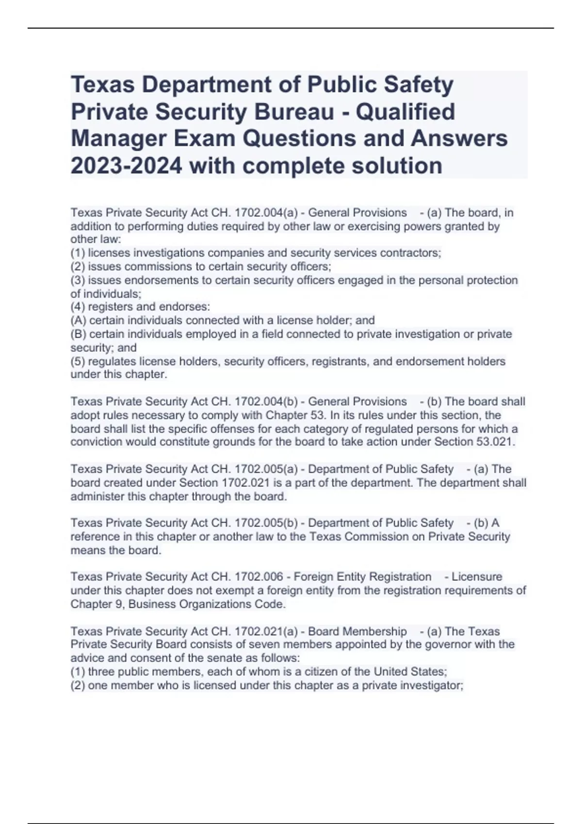 Texas Department of Public Safety Private Security Bureau - Qualified Manager Exam Questions and Answers with complete solution