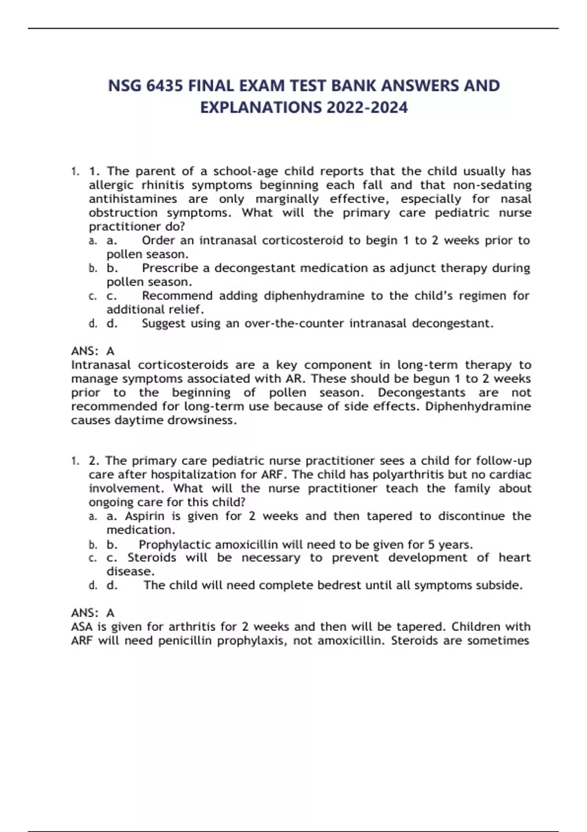 NSG 6435 FINAL EXAM TEST BANK ANSWERS AND EXPLANATIONS 1. 1. The parent of a school-age child reports that the child usually has allergic rhinitis symptoms beginning each fall and that non-sedating antihistamines are only marginally effective, especially for nasal obstruction symptoms. What will the primary care pediatric nurse practitioner do? a. a. Order an intranasal corticosteroid to begin 1 to 2 weeks prior to pollen season. b. b. Prescribe a decongestant medication as adjunct therapy during pollen season. c. c. Recommend adding diphenhydramine to the child’s regimen for additional relief. d. d. Suggest using an over-the-counter intranasal decongestant. ANS: A Intranasal corticosteroids are a key component in long-term therapy to manage symptoms associated with AR. These should be begun 1 to 2 weeks prior to the beginning of pollen season. Decongestants are not recommended for long-term use because of side effects. Diphenhydramine causes daytime drowsiness. 1. 2. The primary care pediatric nurse practitioner sees a child for follow-up care after hospitalization for ARF. The child has polyarthritis but no cardiac involvement. What will the nurse practitioner teach the family about ongoing care for this child? a. a. Aspirin is given for 2 weeks and then tapered to discontinue the medication. b. b. Prophylactic amoxicillin will need to be given for 5 years. c. c. Steroids will be necessary to prevent development of heart disease. d. d. The child will need complete bedrest until all symptoms subside. ANS: A ASA is given for arthritis for 2 weeks and then will be tapered. Children with ARF will need penicillin prophylaxis, not amoxicillin. Steroids are sometimes used for symptomatic relief but do not prevent chronic heart disease. Bed rest is indicated only when cardiac symptoms occur. 1. 3. A school-age child with asthma is seen for a well child checkup and, in spite of “feeling fine,” has pronounced expiratory wheezes, decreased breath sounds, and an FEV1 less than 70% of personal best. The primary care pediatric nurse practitioner learns that the child’s parent administers the daily medium-dose ICS but that the child is responsible for using the SABA. A treatment of 4 puffs of a SABA in clinic results in marked improvement in the child’s status. What will the nurse practitioner do? a. a. Have the parent administer all of the child’s medications. b. b. Increase the ICS medication to a high-dose preparation. c. c. Reinforce teaching about the importance of using the SABA. d. d. Teach the child and parent how to use home PEF monitoring. ANS: D Home PEF monitoring is useful for children to identify when symptoms are worsening. This child does not appear to notice the presence of airway tightness or wheezing and so might benefit from PEF monitoring to know when to use the SABA. School-age children should be learning how to manage their chronic disease, so having the parent administer all medications is not the best choice, especially since use of the SABA is still dependent on the child’s report of symptoms. Since the child responded well to administration of the SABA, increasing the dose of ICS should not be done unless better management is not effective. Reinforcing the teaching is part of the plan but, unless the child is aware of symptoms, may not occur. 1. 4. A child has a fever and arthralgia. The primary care pediatric nurse practitioner learns that the child had a sore throat 3 weeks prior and auscultates a murmur in the clinic. Which test will the nurse practitioner order? a. a. Anti-DNase B test b. b. ASO titer c. c. Rapid strep test d. d. Throat culture ANS: B This child has symptoms and a history consistent with ARF. The ASO titer peaks in 3 to 6 weeks and will confirm a recent strep infection. The antiDNase B test will also confirm a recent strep infection, but this doesn’t peak until 6 to 8 weeks after the initial infection. A rapid strep test and throat culture do not differentiate the carrier state from a true infection. 1. 5. The primary care pediatric nurse practitioner is prescribing ibuprofen for a 25 kg child with JIA who has oligoarthitis. If the child will take 4 doses per day, what is the maximum amount the child will receive per dose? a. a. 200 mg b. b. 250 mg c. c. 400 mg d. d. 450 mg ANS: B The maximum dose is 40 mg/kg/day divided into 3 to 4 doses. 25 kg × 40 mg = 1000/4 = 250 mg. 1. 6. A school-age child who uses a SABA and an inhaled corticosteroid medication is seen in the clinic for an acute asthma exacerbation. After 4 puffs of an inhaled short-acting B2-agonist (SABA) every 20 minutes for three treatments, spirometry testing shows an FEV1 of 60% of the child’s personal best. What will the primary care pediatric nurse practitioner do next? a. a. Administer an oral corticosteroid and repeat the three treatments of the inhaled SABA. b. b. Admit the child to the hospital for every 2 hour inhaled SABA and intravenous steroids. c. c. Give the child 2 mg/kg of an oral corticosteroid and have the child taken to the emergency department. d. d. Order an oral corticosteroid, continue the SABA every 3 to 4 hours, and follow closely.