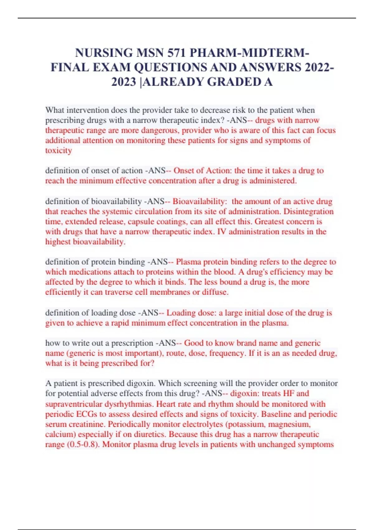 NURSING MSN 571 PHARM-MIDTERMFINAL EXAM QUESTIONS AND ANSWERS 2022- 2023 |ALREADY GRADED A What intervention does the provider take to decrease risk to the patient when prescribing drugs with a narrow therapeutic index? -ANS-- drugs with narrow therapeutic range are more dangerous, provider who is aware of this fact can focus additional attention on monitoring these patients for signs and symptoms of toxicity definition of onset of action -ANS-- Onset of Action: the time it takes a drug to reach the minimum effective concentration after a drug is administered. definition of bioavailability -ANS-- Bioavailability: the amount of an active drug that reaches the systemic circulation from its site of administration. Disintegration time, extended release, capsule coatings, can all effect this. Greatest concern is with drugs that have a narrow therapeutic index. IV administration results in the highest bioavailability. definition of protein binding -ANS-- Plasma protein binding refers to the degree to which medications attach to proteins within the blood. A drug's efficiency may be affected by the degree to which it binds. The less bound a drug is, the more efficiently it can traverse cell membranes or diffuse. definition of loading dose -ANS-- Loading dose: a large initial dose of the drug is given to achieve a rapid minimum effect concentration in the plasma. how to write out a prescription -ANS-- Good to know brand name and generic name (generic is most important), route, dose, frequency. If it is an as needed drug, what is it being prescribed for? A patient is prescribed digoxin. Which screening will the provider order to monitor for potential adverse effects from this drug? -ANS-- digoxin: treats HF and supraventricular dysrhythmias. Heart rate and rhythm should be monitored with periodic ECGs to assess desired effects and signs of toxicity. Baseline and periodic serum creatinine. Periodically monitor electrolytes (potassium, magnesium, calcium) especially if on diuretics. Because this drug has a narrow therapeutic range (0.5-0.8). Monitor plasma drug levels in patients with unchanged symptoms of heart failure after initiation or patient with signs of toxicity- altered heart rate or rhythm, visual or GI disturbances). Patient should be taught to monitor their pulse and know signs of toxicity. What is pharmacodynamic tolerance? -ANS-- Pharmacodynamic tolerance: a state in which a particular dose elicits a smaller response than it did with initial use, results from regular drug use. -intrinsic responsivity of the receptor system diminishes over time What is a side effect of a nonselective b agonist medication? -ANS-- Beta 1: tachycardia, dysrhythmias, angina Beta 2: hyperglycemia, tremor Which assessment finding would be of greatest concern for a provider who is attempting to determine the appropriateness of prescribing the patient a nonselective b agonist? -ANS-- Cardiac disease- any dysrhythmias or previous MI, angina, tachycardia. Because it can cause dysrhythmias and tachycardia. For what purpose will a provider prescribe pilocarpine? -ANS-- Pilocarpine: Muscarinic agonist used mainly for the topical treatment of glaucoma because it reduces intraocular pressure. Second-line drug for open angle glaucoma. Can also treat dry mouth from Sjogren's syndrome. What condition would be contraindicated in using Bethanechol? -ANS-- Bethanechol is a direct acting muscarinic agonist that is used to cause bradycardia, and increases secretions, in GI tract and lungs it causes constriction. Treats non obstructive urinary retention. Contraindications: ASTHMA, because of activation of muscarinic receptors in the lungs cause bronchoconstriction. Also, bowel obstruction. The prescriber has ordered neostigmine for a patient with myasthenia gravis. What physiological process would be assessed to best assure patient safety and the longterm effectiveness of the medication therapy? -ANS-- ANSWER: the patient's current swallowing ability. Many patients hospitalized for myasthenia gravis do not have the muscle strength to swallow well and need a parenteral form of the medication, assessing swallowing ability is an important initial safety measure. When prescribing an anticholinergic drug, what would be a concerning preexisting conditions demonstrates the provider's understanding of possible contraindications to this therapy? And what education would you want to give the patient? -ANS-- Anticholinergic drugs are the same thing as muscarinic antagonists!! These drugs increase heart rate, decrease secretions, relax the bronchi, bladder, and GI tract. Ex. Atropine, oxybutynin, ipratropium. Anticholinergic toxicity- hot as a hare, dry as a bone, red as a beet, blind as a bat, mad as a hatter. Contraindications: glaucoma, intestinal atony, urinary tract obstruction, and tachycardia. Use with caution in patients with asthma. Patient education: void before taking the medication, you can wear sunglasses outdoors for the photosensitivity and avoid hazardous activities if vision is impaired, consume lots of fiber to prevent constipation, avoid exercise in the heat, suck on candy for the dry mouth, stay hydrated. Dopamine is administered to a patient who has hypotension. Other than an increase in blood pressure, which indicator would the provider use to evaluate a successful response? -ANS-- Dopamine is an adrenergic agonist, that mainly effects beta-1 and also alpha-1 at high doses. A successful response would cause an increase in cardiac output, improving tissue perfusion, and an increased heart rate. Dopamine receptors in the kidneys are activated which dilates blood vessels and improves renal perfusion. The provider is discussing home management with a patient who will begin taking an a-adrenergic antagonist for hypertension, how will you educate the patient on this medication? -ANS-- These drugs usually end in -osin, also treat hypertension and BPH. Patient educati