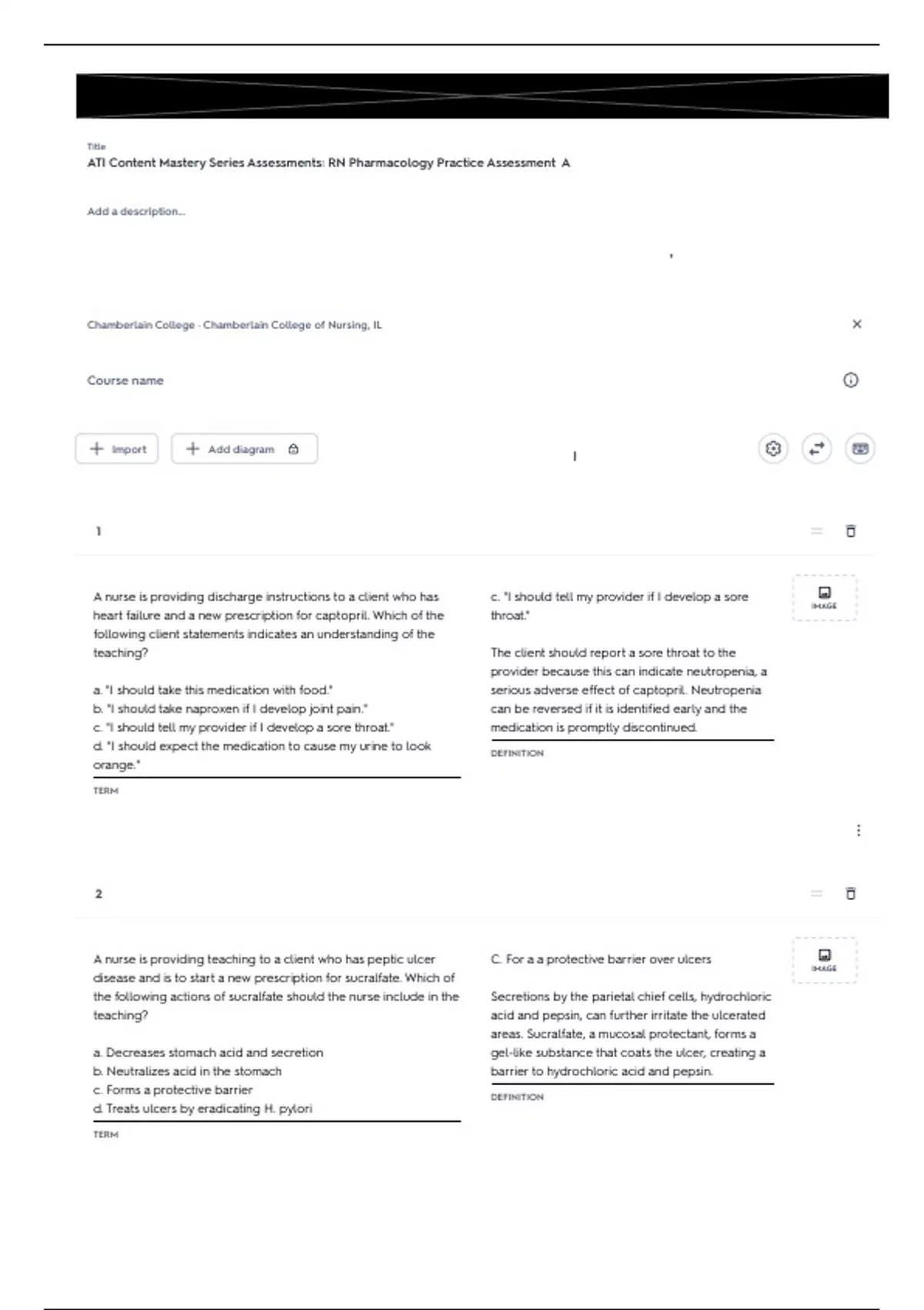 M5.5 ATI Content Mastery Series Assessments: RN Pharmacology Practice Assessment A A nurse is providing discharge instructions to a client who has heart failure and a new prescription for captopril. Which of the following client statements indicates an understanding of the teaching? a. "I should take this medication with food." b. "I should take naproxen if I develop joint pain." c. "I should tell my provider if I develop a sore throat." d. "I should expect the medication to cause my urine to look orange." A nurse is providing teaching to a client who has peptic ulcer disease and is to start a new prescription for sucralfate. Which of the following actions of sucralfate should the nurse include in the teaching? a. Decreases stomach acid and secretion b. Neutralizes acid in the stomach c. Forms a protective barrier d. Treats ulcers by eradicating H. pylori