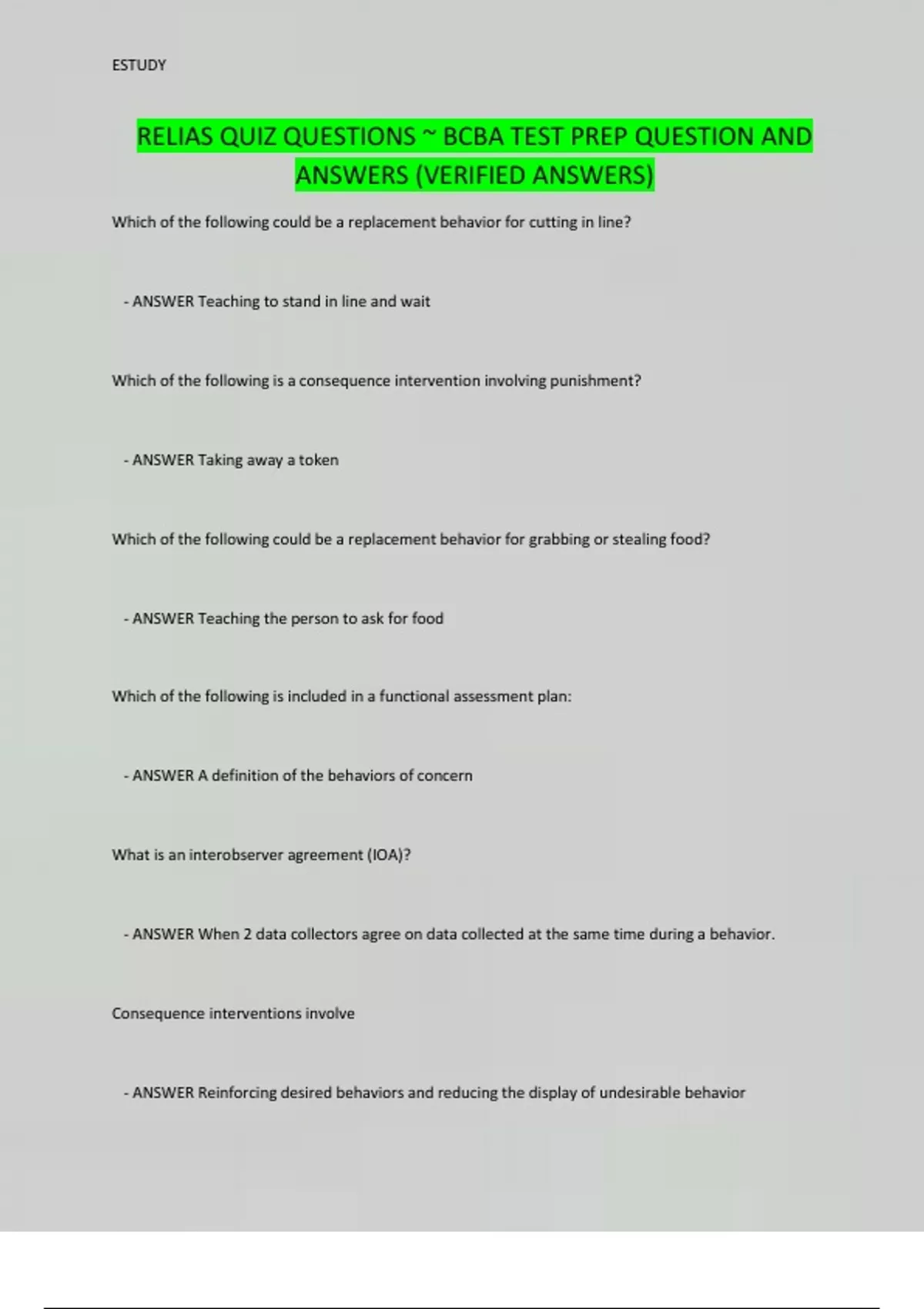 RELIAS QUIZ QUESTIONS ~ BCBA TEST PREP QUESTION AND ANSWERS (VERIFIED ANSWERS)