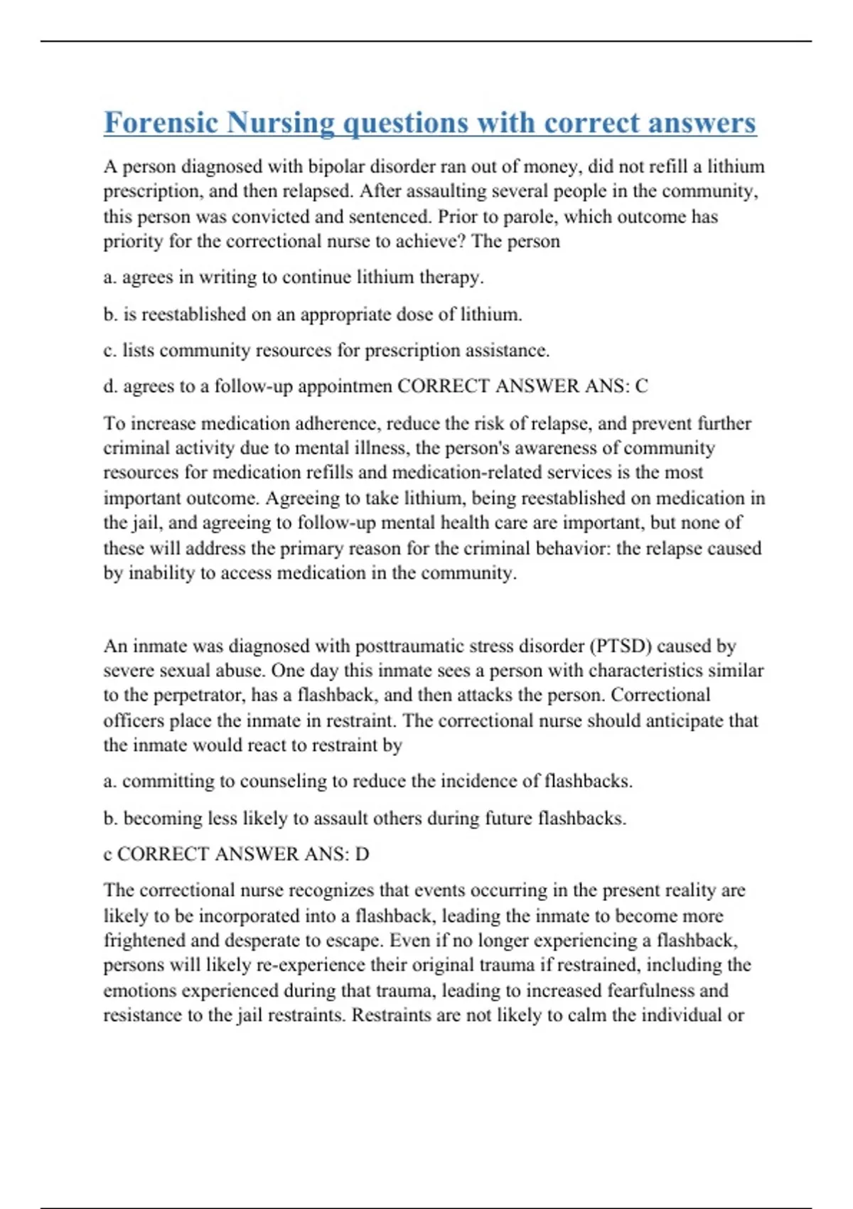 A person diagnosed with bipolar disorder ran out of money, did not refill a lithium prescription, and then relapsed. After assaulting several people in the community, this person was convicted and sentenced. Prior to parole, which outcome has priority for the correctional nurse to achieve? The person a. agrees in writing to continue lithium therapy. b. is reestablished on an appropriate dose of lithium. c. lists community resources for prescription assistance. d. agrees to a follow-up appointmen CORRECT ANSWER ANS: C To increase medication adherence, reduce the risk of relapse, and prevent further criminal activity due to mental illness, the person's awareness of community resources for medication refills and medication-related services is the most important outcome. Agreeing to take lithium, being reestablished on medication in the jail, and agreeing to follow-up mental health care are important, but none of these will address the primary reason for the criminal behavior: the relapse caused by inability to access medication in the community. An inmate was diagnosed with posttraumatic stress disorder (PTSD) caused by severe sexual abuse. One day this inmate sees a person with characteristics similar to the perpetrator, has a flashback, and then attacks the person. Correctional officers place the inmate in restraint. The correctional nurse should anticipate that the inmate would react to restraint by a. committing to counseling to reduce the incidence of flashbacks. b. becoming less likely to assault others during future flashbacks. c CORRECT ANSWER ANS: D
