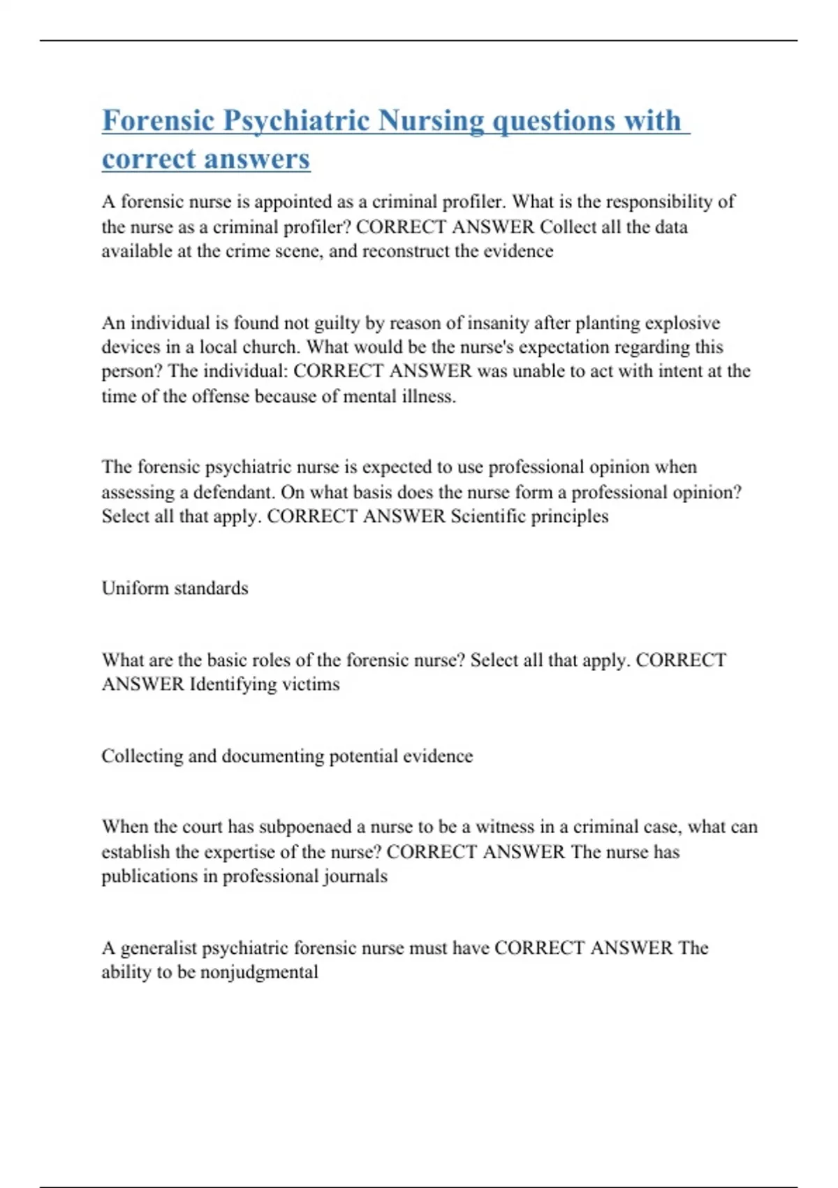 A forensic nurse is appointed as a criminal profiler. What is the responsibility of the nurse as a criminal profiler? CORRECT ANSWER Collect all the data available at the crime scene, and reconstruct the evidence An individual is found not guilty by reason of insanity after planting explosive devices in a local church. What would be the nurse's expectation regarding this person? The individual: CORRECT ANSWER was unable to act with intent at the time of the offense because of mental illness. The forensic psychiatric nurse is expected to use professional opinion when assessing a defendant. On what basis does the nurse form a professional opinion? Select all that apply. CORRECT ANSWER Scientific principles Uniform standards What are the basic roles of the forensic nurse? Select all that apply. CORRECT ANSWER Identifying victims Collecting and documenting potential evidence When the court has subpoenaed a nurse to be a witness in a criminal case, what can establish the expertise of the nurse? CORRECT ANSWER The nurse has publications in professional journals