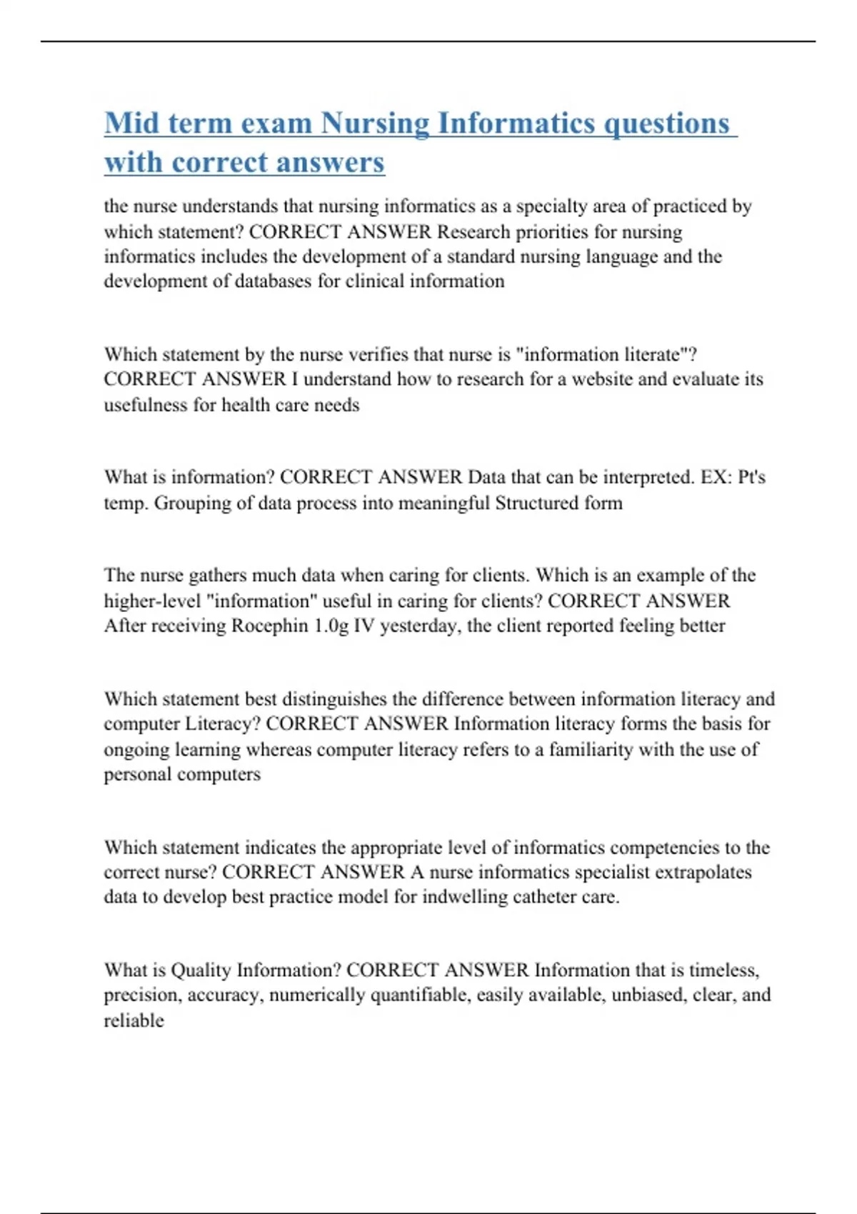 the nurse understands that nursing informatics as a specialty area of practiced by which statement? CORRECT ANSWER Research priorities for nursing informatics includes the development of a standard nursing language and the development of databases for clinical information Which statement by the nurse verifies that nurse is "information literate"? CORRECT ANSWER I understand how to research for a website and evaluate its usefulness for health care needs What is information? CORRECT ANSWER Data that can be interpreted. EX: Pt's temp. Grouping of data process into meaningful Structured form The nurse gathers much data when caring for clients. Which is an example of the higher-level "information" useful in caring for clients? CORRECT ANSWER After receiving Rocephin 1.0g IV yesterday, the client reported feeling better Which statement best distinguishes the difference between information literacy and computer Literacy? CORRECT ANSWER Information literacy forms the basis for ongoing learning whereas computer literacy refers to a familiarity with the use of personal computers Which statement indicates the appropriate level of informatics competencies to the correct nurse? CORRECT ANSWER A nurse informatics specialist extrapolates data to develop best practice model for indwelling catheter care. What is Quality Information? CORRECT ANSWER Information that is timeless, precision, accuracy, numerically quantifiable, easi