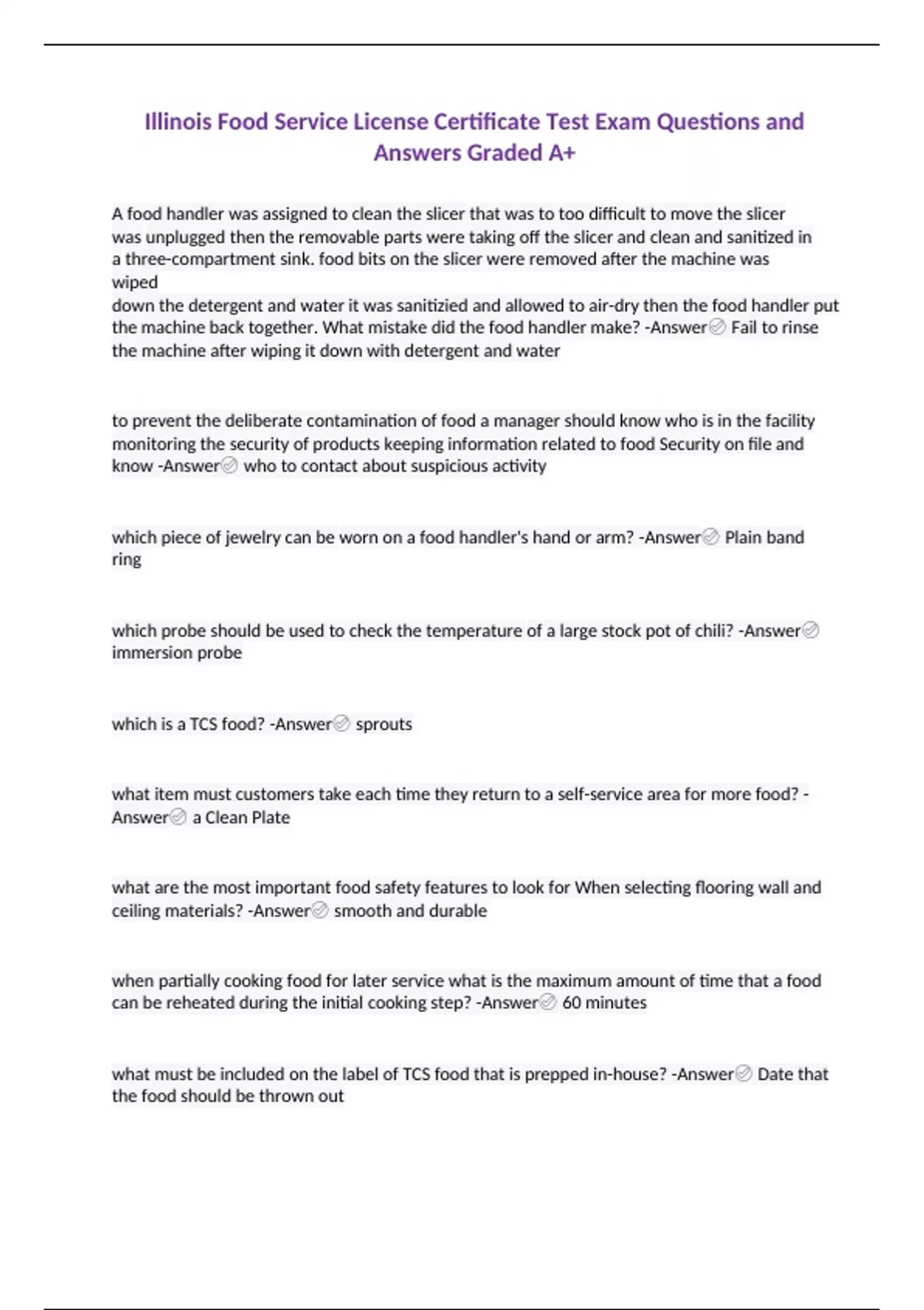 Illinois Food Service License Certificate Test Exam Questions and Answers Graded A+