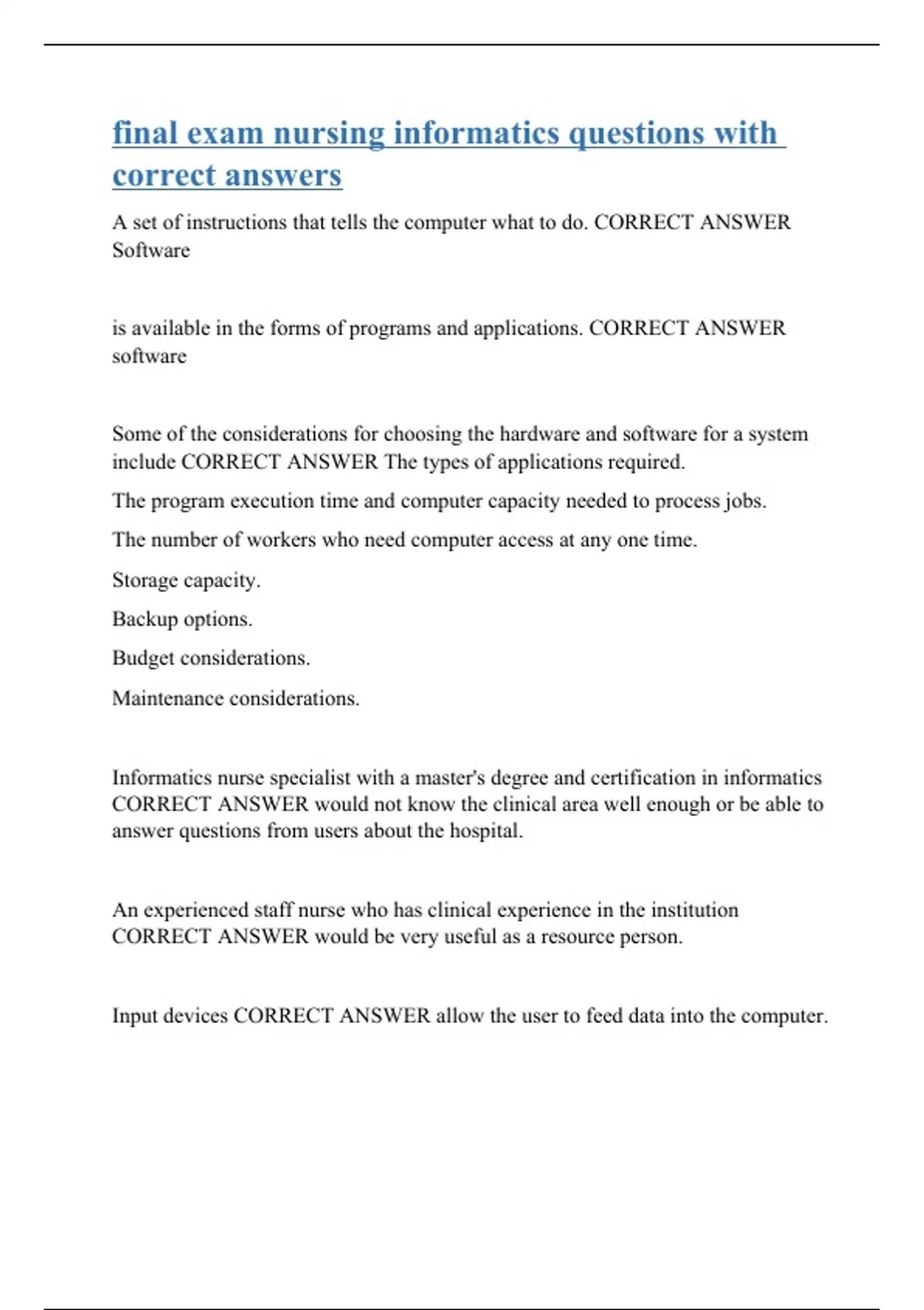A set of instructions that tells the computer what to do. CORRECT ANSWER Software is available in the forms of programs and applications. CORRECT ANSWER software Some of the considerations for choosing the hardware and software for a system include CORRECT ANSWER The types of applications required. The program execution time and computer capacity needed to process jobs. The number of workers who need computer access at any one time. Storage capacity. Backup options. Budget considerations. Maintenance considerations. Informatics nurse specialist with a master's degree and certification in informatics CORRECT ANSWER would not know the clinical area well enough or be able to answer questions from users about the hospital. An experienced staff nurse who has clinical experience in the institution CORRECT ANSWER would be very useful as a resource person. Input devices CORRECT ANSWER allow the user to feed data into the computer. common input devices CORRECT A