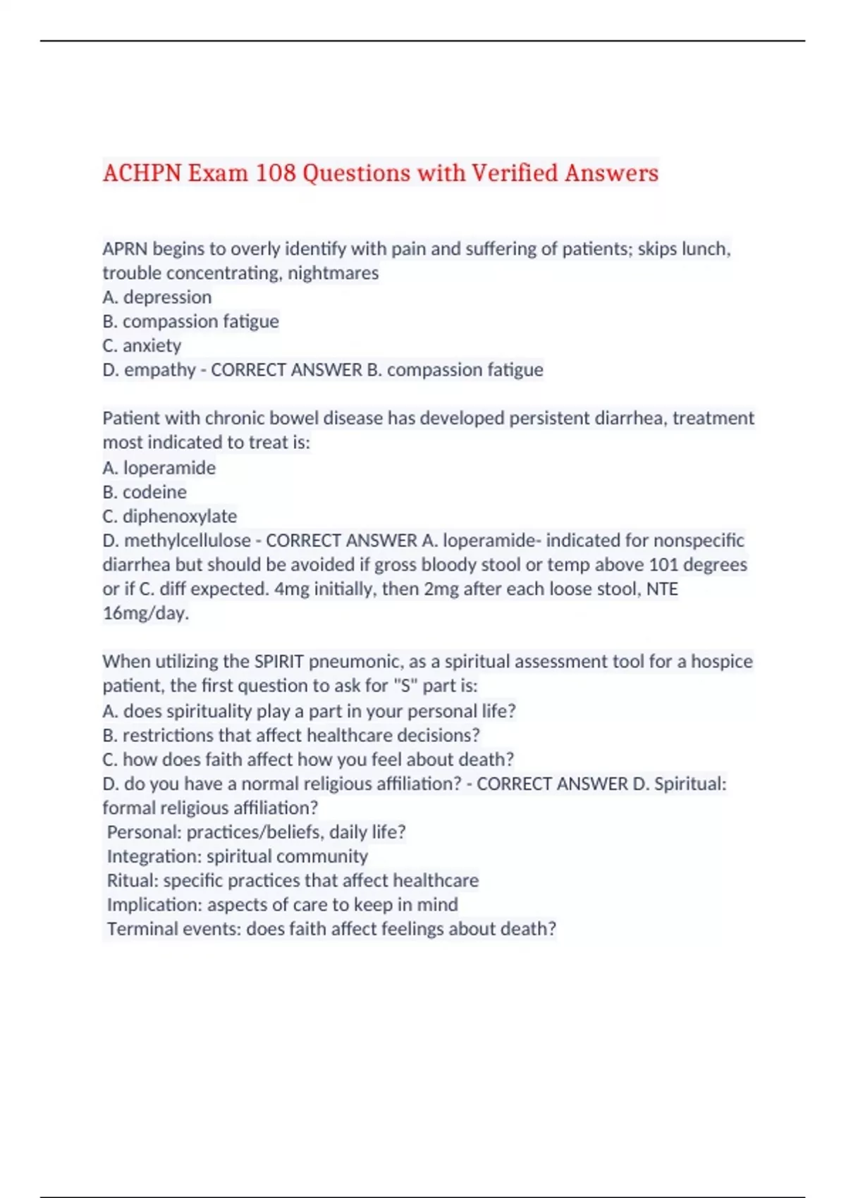 ACHPN Exam 108 Questions with Verified Answers APRN begins to overly identify with pain and suffering of patients; skips lunch, trouble concentrating, nightmares A. depression B. compassion fatigue C. anxiety D. empathy - CORRECT ANSWER B. compassion fatigue Patient with chronic bowel disease has developed persistent diarrhea, treatment most indicated to treat is: A. loperamide B. codeine C. diphenoxylate D. methylcellulose - CORRECT ANSWER A. loperamide- indicated for nonspecific diarrhea but should be avoided if gross bloody stool or temp above 101 degrees or if C. diff expected. 4mg initially, then 2mg after each loose stool, NTE 16mg/day. When utilizing the SPIRIT pneumonic, as a spiritual assessment tool for a hospice patient, the first question to ask for "S" part is: A. does spirituality play a part in your personal life? B. restrictions that affect healthcare decisions? C. how does faith affect how you feel about death? D. do you have a normal religious affiliation? - CORRECT ANSWER D. Spiritual: formal religious affiliation? Personal: practices/beliefs, daily life? Integration: spiritual community Ritual: specific practices that affect healthcare Implication: aspects of care to keep in mind Terminal events: does faith affect feelings about death? Obese patient, diabetes; underwent surgery for bowel obstruction 6 days ago and has persistent N/V. Feels "popping" sensation at incision site-->intestinal evisceration. Initial response: A. administer opioid, no intervention B. semi-fowler's knees up, notify surgeon C. explain what is happening, ask for guidance D. supinate patient, cover with dry sterile gauze - CORRECT ANSWER B. INITIAL RESPONSE: notify surgeon Next- cover sterile soaked gauze, IV site, O2 76 year old female, generally good health, new pathologic fracture of proximal femur. pt states it occurred while walking- most likely cause: A. abuse B. multiple myeloma C. osteoporosis D. bone cyst - CORRECT ANSWER C. osteoporosis- DEXA scan gold standard; T-score -2 indicates osteoporosis When collaborating with patient and family on POC, it's important for them to understand: A. rights and responsibilities B. limitations C. organizations philosophy D. difference between goals and objectives - CORRECT ANSWER A. rights and responsibilities- ask them what goals and expectations are, what is important to them Native American patient, stage IV multiple myeloma, on hospice in extended care facility. Reportedly little pain AEB does not request medicine but does lay in fetal position and refuses food and fluids. APRN should advise nursing staff: A. pt probably comfortable without pain medication B. pt may avoid outward expressions of pain C. staff nurse should be more aware of pt needs D. pt probably prefers to suffer than take medications - CORRECT ANSWER B. pt may avoid outward expressions of pain, but his body language indicates otherwise Middle Eastern hospice pt, cared for at home by sisters and daughters. On exam, rows of circular slightly reddened areas up and down back. Most appropriate response: A. notify APS of abuse B. tell family hospice pts cannot receive cupping C. acknowledge use of cupping D. provide supportive care for pressure sores - CORRECT ANSWER C. acknowledge cupping- ancient form of healing that releases toxins Pt with progressive onset MS has chronic bladder dysfunction with spasms, frequency, incontinence. He takes ER oxybutynin. Which dietary restrictions should APRN advise? A. simple carbs B. citrus fruits C. apples and apple juice D. caffeine and alcohol - CORRECT ANSWER D. caffeine and alcohol are bladder irritants and promote diuresis Family reports patient has not attended mass in 50 years. Pt is nearing death but remains responsive and not requested priest. APRN should: A. assume pt will not want to see a priest B. ask priest on call to visit C. ask the patient if he/she wants to see a priest D. ask the family if priest should be called - CORRECT ANSWER C. ask the patient, never make assumptions When educating a patient or family about disease or treatment, the first step is to begin by assessing the patient's: A. emotional status B. knowledge base C. experience D. physical condition - CORRECT ANSWER B. knowledge base- first assess by asking "can you tell me what you know about your illness"? Indications that the spouse of a patient who died is suffering from traumatic grief include prolonged period (>60 days): A. expressing anger, bitterness, blame regarding the death B. decrying negative habits of deceased (smoking, drinking) C. focusing on occupational role D. talking frequently about the deceased - CORRECT ANSWER A. expressing anger, bitterness, blame regarding death --> also indications include avoiding talking about deceased, avoiding occupational/social roles, assuming some bad habits of the deceased A family member is concerned about the "death rattle" exhibited by a patient. When discussing administration of antimuscarinic agents such as glycopyrrolate, what possible adverse effects should be considered? A. increased sedation, delirium, xerostomia B. prolonged suffering, inability to communicate C. insomnia, depression, anxiety D. excessive sedation, respiratory depression, itching - CORRECT ANSWER A. increased sedation, delirium, xerostomia When conducting a review of the literature as part of evidence based research, the level of evidence that is based on a quasi-experimental study such as a matched case control study would be categorized as: A. level I B. level II C. level III D. level IV - CORRECT ANSWER C. Level III Level 1- meta analysis Level 2- well designed, may or may not be randomized Level 3- case control, quasi experimental study Level 4- comparative non-experimental Level 5- case reports without evidence A patient has osteomyelitis and an open draining wound in the proximal anterior thigh with copious amounts of purulent drainage. The wound has been requiring dressing changes 4-5 times per day. The effective method for managing th