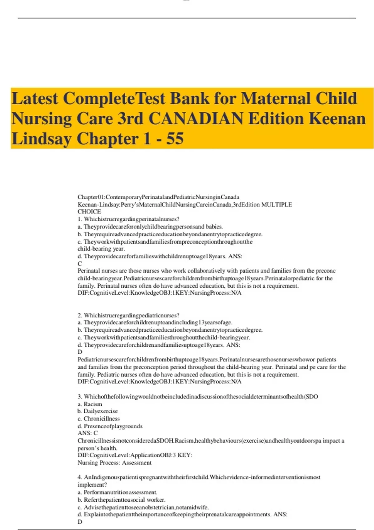 Latest CompleteTest Bank for Maternal Child Nursing Care 3rd CANADIAN Edition Keenan Lindsay Chapter 1 - 55