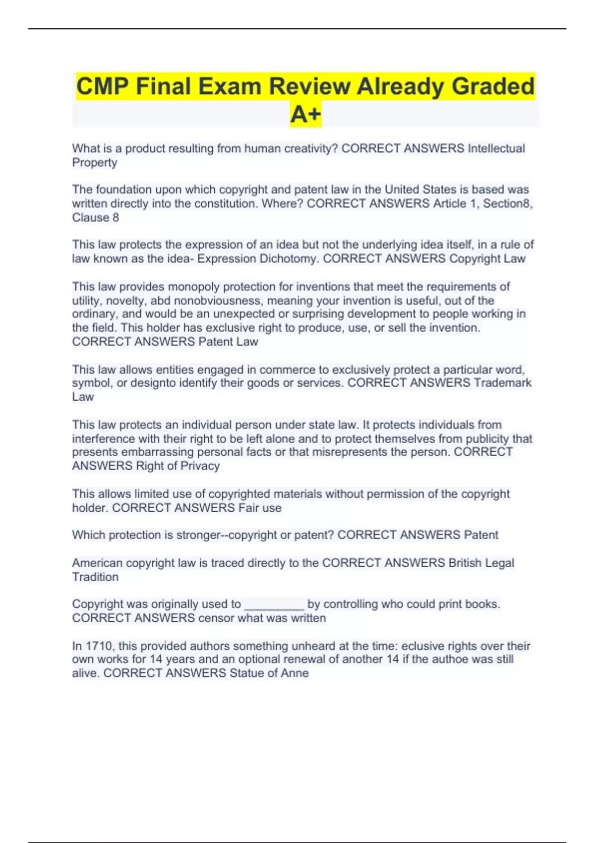 CMP Final Exam Review Already Graded A+