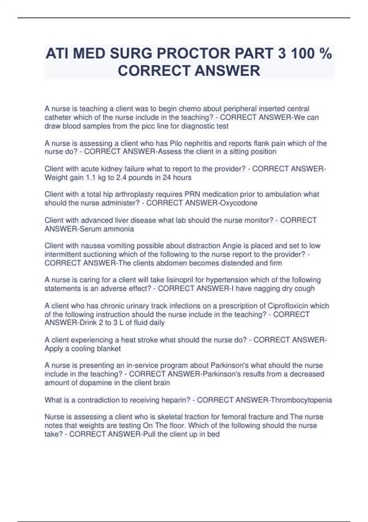 ATI MED SURG PROCTOR PART 3 100 % CORRECT ANSWER A nurse is teaching a client was to begin chemo about peripheral inserted central catheter which of the nurse include in the teaching? - CORRECT ANSWER-We can draw blood samples from the picc line for diagnostic test A nurse is assessing a client who has Pilo nephritis and reports flank pain which of the nurse do? - CORRECT ANSWER-Assess the client in a sitting position Client with acute kidney failure what to report to the provider? - CORRECT ANSWERWeight gain 1.1 kg to 2.4 pounds in 24 hours Client with a total hip arthroplasty requires PRN medication prior to ambulation what should the nurse administer? - CORRECT ANSWER-Oxycodone Client with advanced liver disease what lab should the nurse monitor? - CORRECT ANSWER-Serum ammonia Client with nausea vomiting possible about distraction Angie is placed and set to low intermittent suctioning which of the following to the nurse report to the provider? - CORRECT ANSWER-The clients abdomen becomes distended and firm A nurse is caring for a client will take lisinopril for hypertension which of the following statements is an adverse effect? - CORRECT ANSWER-I have nagging dry cough A client who has chronic urinary track infections on a prescription of Ciprofloxicin which of the following instruction should the nurse include in the teaching? - CORRECT ANSWER-Drink 2 to 3 L of fluid daily A client experiencing a heat stroke what should the nurse do? - CORRECT ANSWERApply a cooling blanket A nurse is presenting an in-service program about Parkinson's what should the nurse include in the teaching? - CORRECT ANSWER-Parkinson's results from a decreased amount of dopamine in the client brain What is a contradiction to receiving heparin? - CORRECT ANSWER-Thrombocytopenia Nurse is assessing a client who is skeletal traction for femoral fracture and The nurse notes that weights are testing On The floor. Which of the following should the nurse take? - CORRECT ANSWER-Pull the client up in bed A client has acute gout which of the following lab results for the nurse expect to increase? - CORRECT ANSWER-Uric acid A nurse is providing teaching to a client to start furosemide therapy for heart failure which of the following statements indicates a client understanding a potential adverse effect of this medication? - CORRECT ANSWER-I'm going to include more cantaloupe in my diet A nurse is reinforcing discharge teaching a client with a new diagnosis of SLE lupus which of the following statements by the client indicates an understanding of the teaching? - CORRECT ANSWER-I should take ibuprofen for my joint pain A nurse is monitoring a client following a thyroidectomy which of the following findings should the nurse identify as an indication of hypo parathyroidism? - CORRECT ANSWER-Involuntary muscle spasms And Nurse is reinforcing teaching a client with a new diagnosis of multiple sclerosis the client asked the nurse about a usual course which of the following is the response to make? - CORRECT ANSWER-Acute episodes are usually followed by remissions which can lasts varying lengths of time A nurse is preparing to administer timolol eyedrops for client with glaucoma, when installing the medication What action should the nurse take? - CORRECT ANSWERApply pressure to the bridge of the nose after installation of the medication A client has type one diabetes and a glucose reading of 48 what should the nurse expect? - CORRECT ANSWER-Diaphoresis A client who is scheduled for sigmoid resection with colostomy what indicates a need for further teaching? - CORRECT ANSWER-My diet will have to change to a soft diet after surgery Indication of a skull fracture from a fall? - CORRECT ANSWER-Clear fluid coming from the nares A nurse is preparing to admit a client who is dysphasia dealership plan to place which of the following items at the bedside? - CORRECT ANSWER-Suction machine A nurse is caring for a client who has a seizure which of the following is the nurses priority? - CORRECT ANSWER-Turn the client to the side A nurse is providing teaching to a client with hypothyroidism and receiving levothyroxine the nurse should instruct the client that was the following supplements can interfere with the effectiveness of the medication? - CORRECT ANSWER-Calcium Nurse is providing teaching to a client with esophageal cancer and he's to undergo radiation therapy which of the following statement to the nurse identify as an indication that the client will understand the teaching? - CORRECT ANSWER-I will use my hands rather than use a washcloth to clean the radiation area The nurse notes the formation of a hematoma at the insertion site and decrease pulse rate in the affected extremity Which of the following interventions is the nurses priority? - CORRECT ANSWER-Reply firm pressure to the insertion site A nurse is caring for a client was emphysema and receiving medication ventilation the client appears anxious restless and high-pressure alarm is sounding which of the following action should the nurse take first? - CORRECT ANSWER-And check the client to allow the machine to breathe for him Client was cirrhosis lab value to expect - CORRECT ANSWER-Elevated bilirubin level Client with total hip arthroplasty what lab value to report to the provider? - CORRECT ANSWER-Report hemoglobin 8 A nurse is caring for a client who is undergoing hemodialysis to treat end-stage kidney disease the client reports muscle cramps and tingling sensation in their hands what should the nurse administer? - CORRECT ANSWER-Calcium carbonate What is the nurse need to tell an active TB patient for discharge? - CORRECT ANSWER-Sputum specimens are needed every 2 to 4 weeks until the three negative samples What is the Romberg test for? - CORRECT ANSWER-check balance Have the patient stand have them close their eyes with only minimal swaying Glascoma Scale: - CORRECT ANSWER-3 is the worst in a deep coma 15 is the best The nurse is reviewing admission orders shown per patien