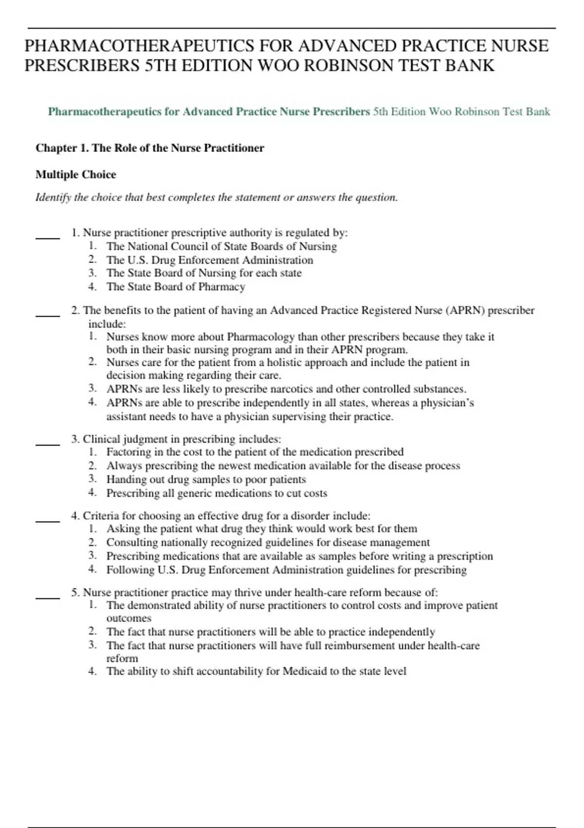 PHARMACOTHERAPEUTICS FOR ADVANCED PRACTICE NURSE PRESCRIBERS 5TH EDITION WOO ROBINSON TEST BANK