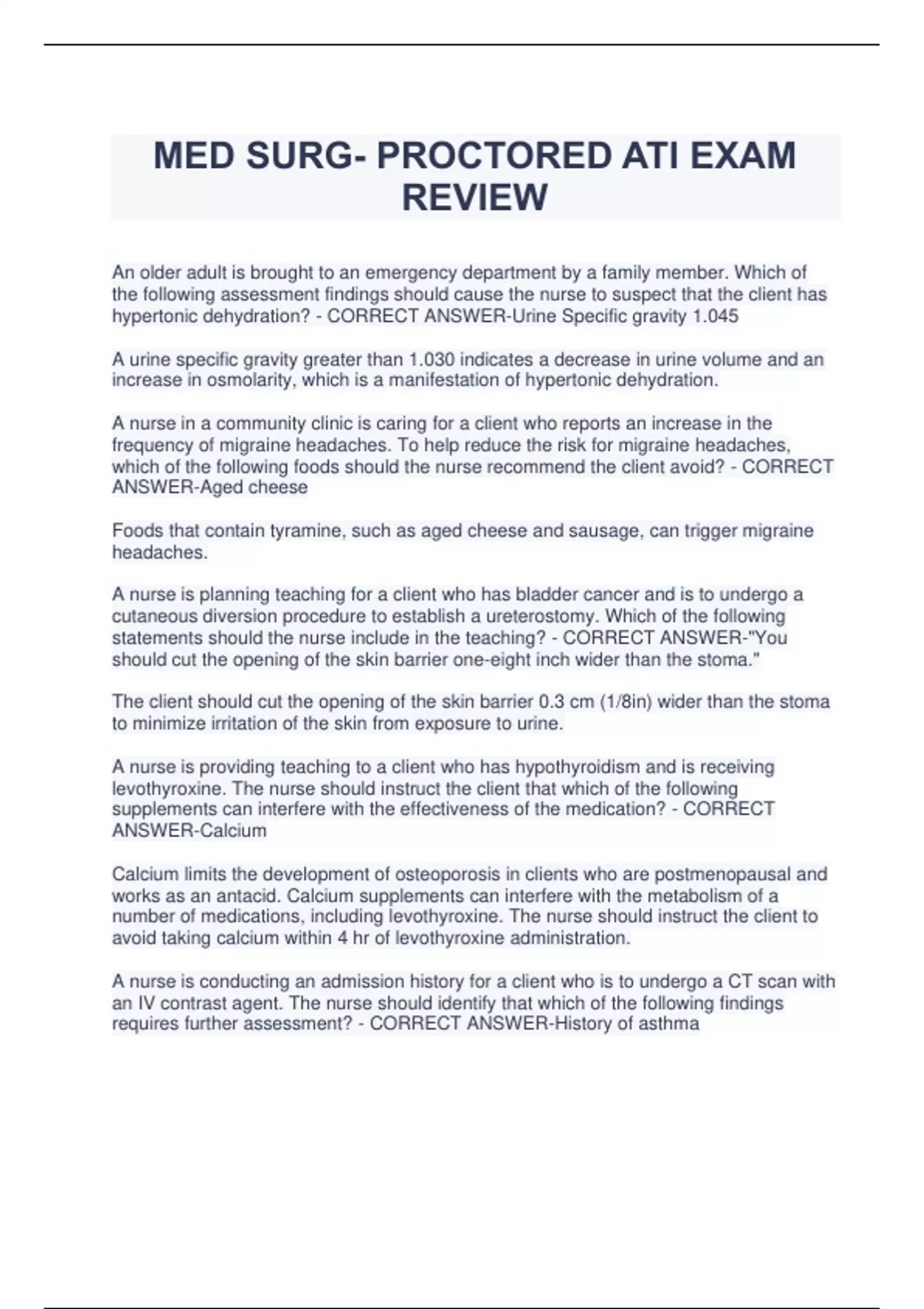 MED SURG- PROCTORED ATI EXAM REVIEW An older adult is brought to an emergency department by a family member. Which of the following assessment findings should cause the nurse to suspect that the client has hypertonic dehydration? - CORRECT ANSWER-Urine Specific gravity 1.045 A urine specific gravity greater than 1.030 indicates a decrease in urine volume and an increase in osmolarity, which is a manifestation of hypertonic dehydration. A nurse in a community clinic is caring for a client who reports an increase in the frequency of migraine headaches. To help reduce the risk for migraine headaches, which of the following foods should the nurse recommend the client avoid? - CORRECT ANSWER-Aged cheese Foods that contain tyramine, such as aged cheese and sausage, can trigger migraine headaches. A nurse is planning teaching for a client who has bladder cancer and is to undergo a cutaneous diversion procedure to establish a ureterostomy. Which of the following statements should the nurse include in the teaching? - CORRECT ANSWER-"You should cut the opening of the skin barrier one-eight inch wider than the stoma." The client should cut the opening of the skin barrier 0.3 cm (1/8in) wider than the stoma to minimize irritation of the skin from exposure to urine. A nurse is providing teaching to a client who has hypothyroidism and is receiving levothyroxine. The nurse should instruct the client that which of the following supplements can interfere with the effectiveness of the medication? - CORRECT ANSWER-Calcium Calcium limits the development of osteoporosis in clients who are postmenopausal and works as an antacid. Calcium supplements can interfere with the metabolism of a number of medications, including levothyroxine. The nurse should instruct the client to avoid taking calcium within 4 hr of levothyroxine administration. A nurse is conducting an admission history for a client who is to undergo a CT scan with an IV contrast agent. The nurse should identify that which of the following findings requires further assessment? - CORRECT ANSWER-History of asthma A client who has a history of asthma has a greater risk of reacting to the contrast dye used during the procedure. Other conditions that can result in a reaction to contrast media include allergies to foods, such as shellfish, eggs, milk, and chocolate. A nurse in an ICU is assessing a client who has a traumatic brain injury. Which of the following findings should the nurse identify as a component of Cushing's triad? - CORRECT ANSWER-Bradycardia A client who has increased intracranial pressure from a traumatic brain injury can develop bradycardia, which is one component of Cushing's triad. The other components of Cushing's triad are severe hypertension and a widened pulse pressure. A nurse is planning to irrigate and dress a clean, granulating wound for a client who has a pressure injury. Which of the following actions should the nurse take? - CORRECT ANSWER-Use a 30-mL syringe The nurse should use a 30-mL to 60-mL syringe with an 18- or 19- gauge catheter to deliver the ideal pressure of 8 pounds per square inch (psi) when irrigating a wound. To maintain healthy granulation tissue, the wound irrigation should be delivered at between 4 and 15 psi. A nurse in an emergency department is reviewing the provider's prescriptions for a client who sustained a rattlesnake bite to the lower leg. Which of the following prescriptions should the expect? - CORRECT ANSWER-Administer an opioid analgesic to the client. The nurse should expect a prescription for an opioid analgesic to promote comfort following a rattlesnake bite. A nurse is reviewing the health record of a client who is scheduled for allergy skin testing. The nurse should postpone the testing and report to the provider which of the following findings? (Click on the "Exhibit" button for additional information about the client). - CORRECT ANSWER-Current medications The nurse should review the client's medication record and identify medications, including ACE inhibitors, beta blockers, theophylline, nifedipine, and glucocorticoids, such as prednisone, that can alter the allergy skin test results. These medications can diminish the client's reaction to the allergens. The nurse should notify the provider and instruct the client to discontinue prednisone for 2 weeks before allergy skin testing. A nurse is a caring for a client who is on bed rest and has a new prescription for enoxaparin subcutaneous. Which of the following actions should the nurse take? - CORRECT ANSWER-Inject the medication into the anterolateral abdominal wall. The nurse should inject the medication into the anterolateral or posterolateral abdominal wall to enhance medication absorption and prevent hematoma formation. A nurse is caring for a client who has a stage III pressure injury. Which if the following findings contribute to delayed wound healing? - CORRECT ANSWER-Urine output 25 mL/hr Urinary output reflects fluid status. Inadequate urine output can indicate dehydration, which can delay wound healing. A nurse is caring for a client who has a new prescription for total parenteral nutrition (TPN). The client is to receive 2,000 kcal per day. The TPN solution has 500kcal/L. The IV pump should be set at how many mL/hr? (Rounding to the nearest whole number.) - CORRECT ANSWER-167 mL/hr A nurse is teaching a client who has a family history of colorectal cancer. To help mitigate this risk, which of the following dietary alterations should the nurse recommend? - CORRECT ANSWER-Add cabbage to the diet. To help reduce the risk for colorectal cancer, the client should consume a diet that is high in fiber, low in fat, and low in refined carbohydrates. Brassica vegetables such as cabbage, cauliflower, and broccoli, are high in fiber. A nurse is caring for a client who has a prescription for silver sulfadiazine cream to be applied to her burn wounds. The nurse should evaluate the client for which of the following laboratory findings? - CO