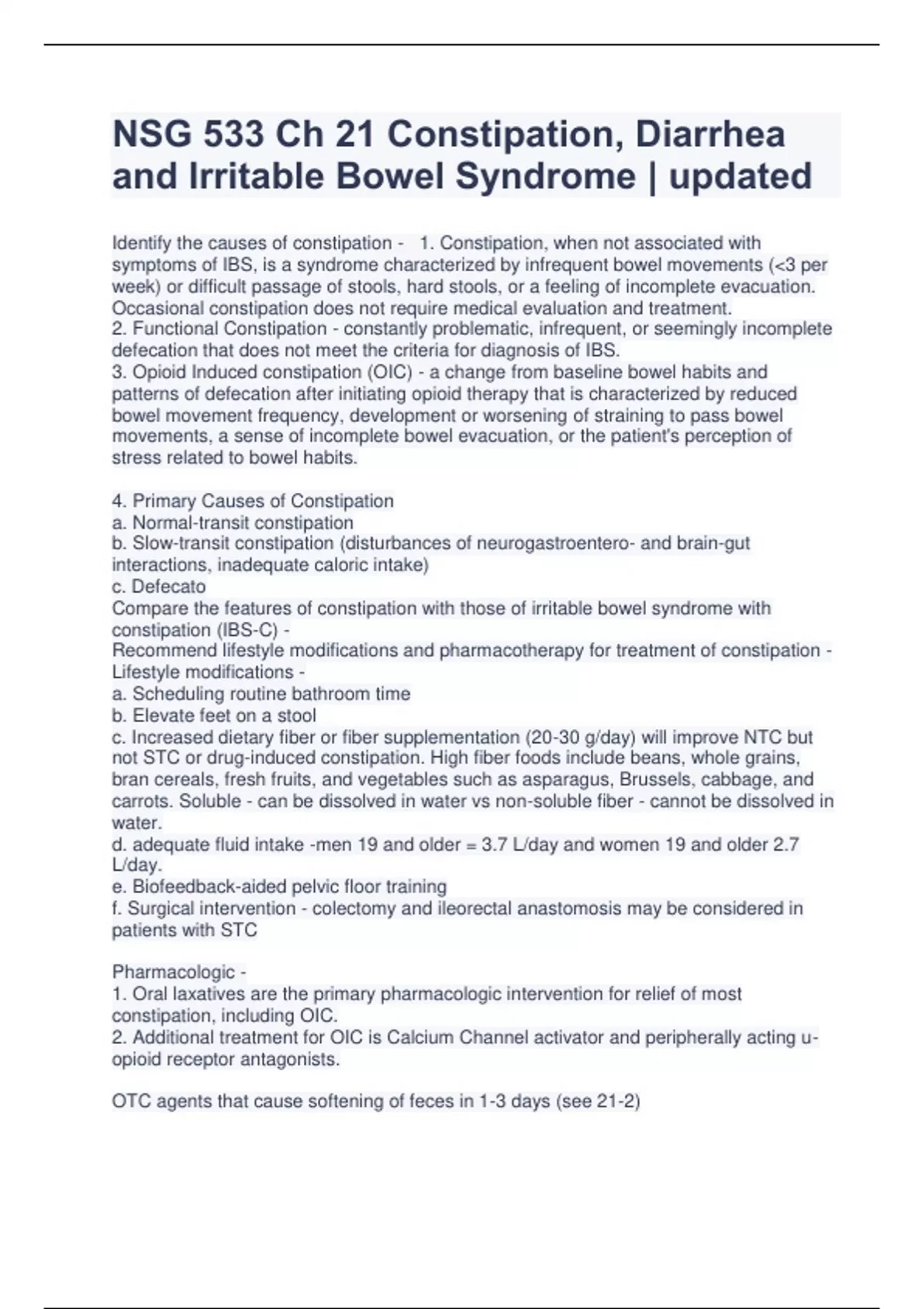 NSG 533 Ch 21 Constipation, Diarrhea and Irritable Bowel Syndrome | updated