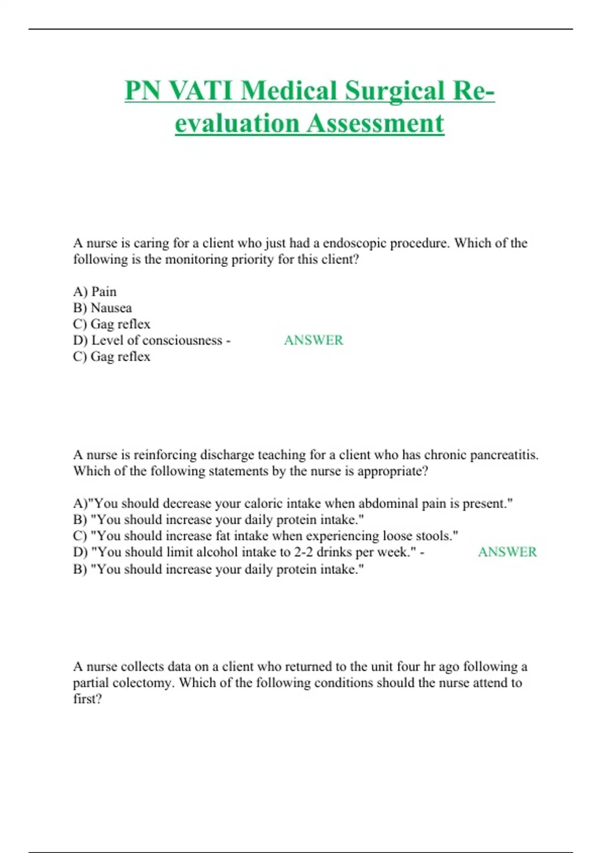 PN VATI Medical Surgical Re-evaluation Assessment A nurse is caring for a client who just had a endoscopic procedure. Which of the following is the monitoring priority for this client? A) Pain B) Nausea C) Gag reflex D) Level of consciousness - ANSWER C) Gag reflex A nurse is reinforcing discharge teaching for a client who has chronic pancreatitis. Which of the following statements by the nurse is appropriate? A)"You should decrease your caloric intake when abdominal pain is present." B) "You should increase your daily protein intake." C) "You should increase fat intake when experiencing loose stools." D) "You should limit alcohol intake to 2-2 drinks per week." - ANSWER B) "You should increase your daily protein intake." A nurse collects data on a client who returned to the unit four hr ago following a partial colectomy. Which of the following conditions should the nurse attend to first? A) Change the moderately saturated dressing. B) Administer analgesic medication for incisional pain. C) Catheterize for a distended bladder. D) Cough and deep breathe client. - ANSWER B) Administer analgesic medication for incisional pain. Rationale: Administer pain medication to establish comfort and then attend to the other reported condition. A nurse is reinforcing discharge teaching on actions that improve gas exchange to a client diagnosed with emphysema. Which of the following instructions should be included in the teaching? A) Resting in a supine position B) Elevating arms while performing ADLs C) Breathing in through the nose and out through pursed lips. D) Increasing oxygen delivery to 5 L/min during times of distress. - ANSWER C) Breathing in through the nose and out through pursed lips. A nurse is assessing a client who is African-American and who is jaundice. Which of the following areas are the most reliable for the nurse to inspect? A) Palms of hands B) Hard palate C) Sclera D) Nail beds - ANSWER Hard palate