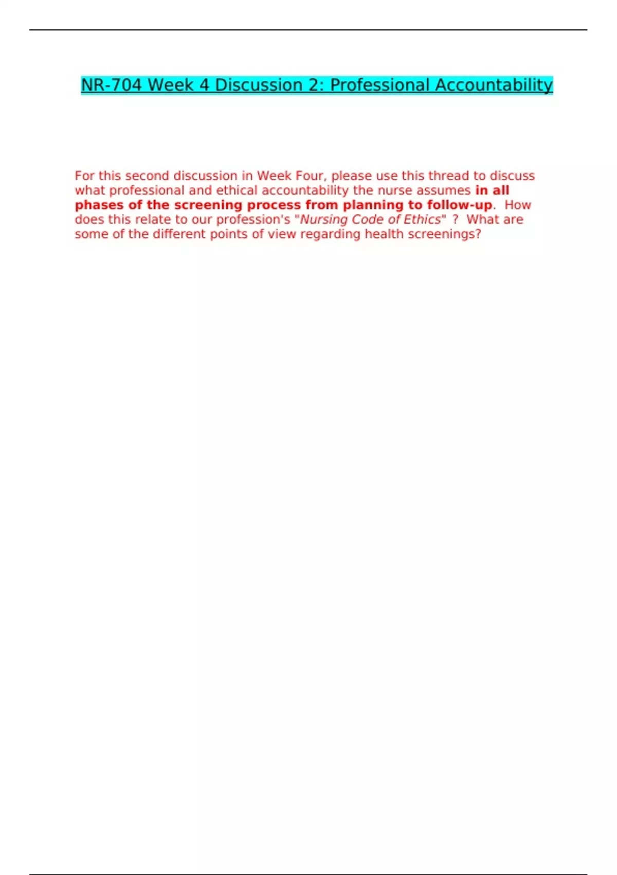 NR-704 WEEK 4 DISCUSSION 2 CORRECTLY ANSWERED /LATEST UPDATE VERSION/ GRADED A+