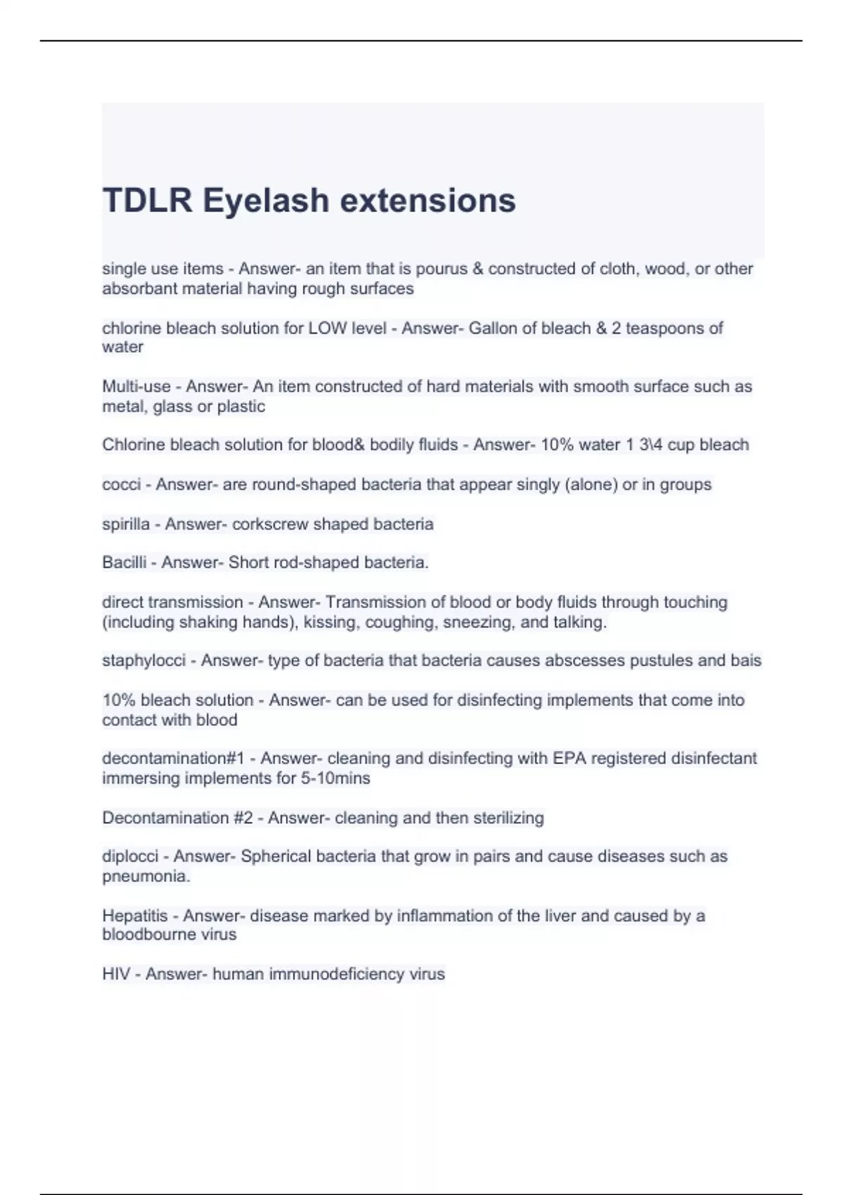 TDLR Eyelash extensions Exam Questions with correct Answers