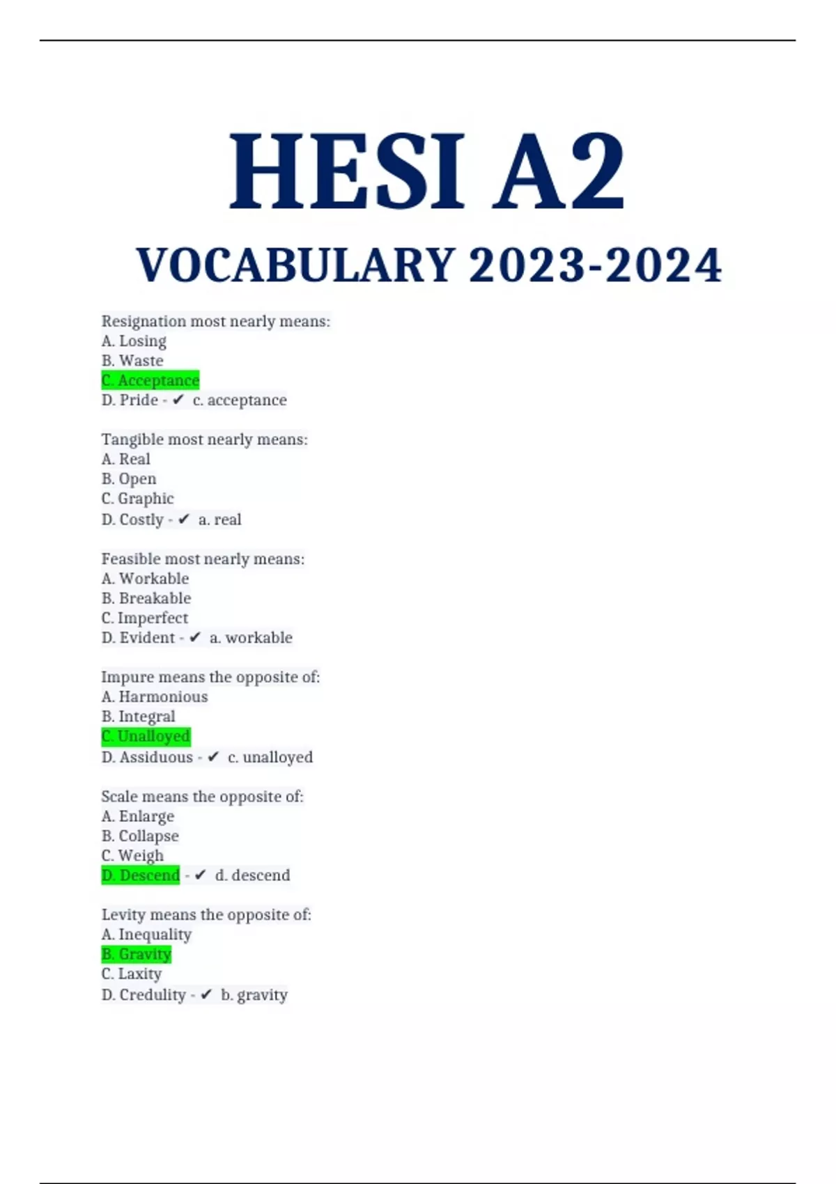Exam of 20 pages for the course Hesi A2 at Hesi A2 (HESI A2 VOCABULARY)