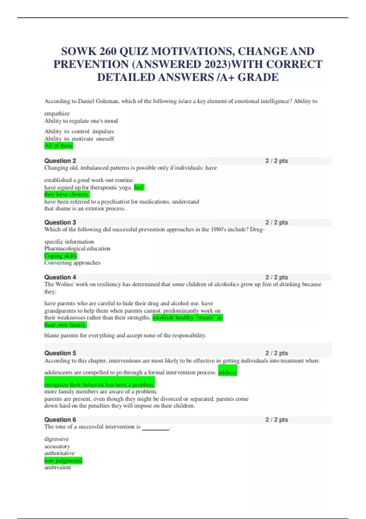 SOWK 260 QUIZ MOTIVATIONS, CHANGE AND PREVENTION (ANSWERED 2023)WITH CORRECT DETAILED ANSWERS /A+ GRADE According to Daniel Goleman, which of the following is/are a key element of emotional intelligence? Ability to empathize Ability to regulate one's mood Ability to control impulses Ability to motivate oneself All of these Changing old, imbalanced patterns is possible only if individuals: have established a good work-out routine. have signed up for therapeutic yoga. feel they have choices. have been referred to a psychiatrist for medications. understand that shame is an exterior process. Which of the following did successful prevention approaches in the 1980's include? Drug-specific information Pharmacological education Coping skills Converting approaches The Wolins' work on resiliency has determined that some children of alcoholics grow up free of drinking because they: have parents who are careful to hide their drug and alcohol use. have grandparents to help them when parents cannot. predominantly work on their weaknesses rather than their strengths. establish healthy "rituals" in their own family. blame parents for everything and accept none of the responsibility. According to this chapter, interventions are most likely to be effective in getting individuals into treatment when: adolescents are compelled to go through a formal intervention process. addicts recognize their behavior has been a problem. more family members are aware of a problem. parents are present, even though they might be divorced or separated. parents come down hard on the penalties th