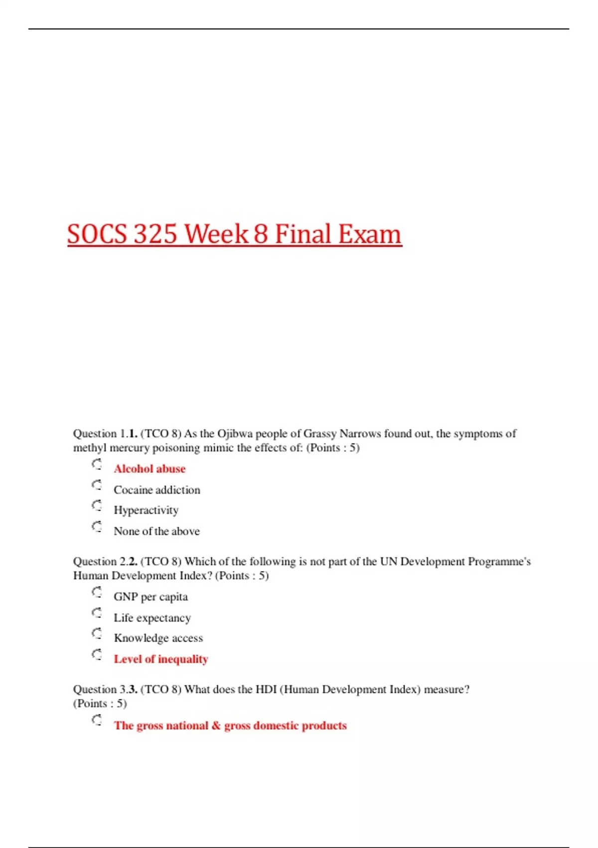 SOCS 325 Week 8 Final Exam Question 1.1. (TCO 8) As the Ojibwa people of Grassy Narrows found out, the symptoms of methyl mercury poisoning mimic the effects of: (Points : 5) Alcohol abuse Cocaine addiction Hyperactivity None of the above Question 2.2. (TCO 8) Which of the following is not part of the UN Development Programme's Human Development Index? (Points : 5) GNP per capita Life expectancy Knowledge access Level of inequality Question 3.3. (TCO 8) What does the HDI (Human Development Index) measure? (Points : 5) The gross national & gross domestic products The physiological growth rate of impoverished children The extent of human misery that results from poverty & environmental problems Quality of life indicators such as literacy, life expectancy, standard of living & purchasing power Question 4.4. (TCO 8) Ulrich Beck argues that the driving force behind the risk society can be characterized by which of the following statements? (Points : 5) I am hungry. I am angry. I am lonely. I am afraid. Question 5.5. (TCO 8) The chapter concludes by saying that in order to construct a dialogic rationality of risk, we need to cultivate: (Points : 5) trust. truth. theory. trees. Question 6.6. (TCO 8) Which of the following arguments contradicts the risk society theory? (Points : 5) Environmental bads are not equally distributed. In poor countries, "I am hungry" is a driving force of environmental concerns. The wealthy elite are able to better protect themselves from environmental problems. All of the above Question 7.7. (TCO 9) The most important feature of the carnivalesque body is: (Points : 5) it is a source of bathroom humor. it is forever interacting & exchanging with the natural world. it is the source of our individualism. it is dirty, indecent, & obscene. Question 8.8. (TCO 9) Which of the following expresses the values & assumptions of patriarchal ecology? (Points : 5) Women's association with reproduction & the domestic sphere places them closer to nature. Men's association with production & the public sphere distances them from nature. Women are associated with fulfilling bodily & emotional needs, while men are associated with rationality, civilization, government, & business. All of the above Question 9.9. (TCO 9) Forever interacting & exchanging with the natural world is the most important feature of the: (Points : 5) bathroom humor. carnivalesque body. individualist. dirty, indecent, & obscene. Question 10.10. (TCO 9) The chief philosophical contribution of the Sophists in environmental discussions was: (Points : 5) the contention that money & politics, rather than the Greek gods, moved the world of everyday life. the role of self-interest in all human affairs. moral order is based on nothing more than convention, in other words, morality is a con game. proof that Plato & Aristotle were wrong. Question 1.1. (TCO 9) Who made the following statement: "In wildness is the preservation of the world"? (Points : 5) Rachel Carson Lao Tzu Aristotle Henry David Thoreau Question 2.2. (TCO 9) "Human are part of nature & need to maintain a sense of balance & limits in an interconnected world." This statement best describes which paradigm? (Points : 5) The dominant paradigm The old paradigm The human-exceptionalism paradigm The ecological-social paradigm Question 3.3. (TCO 9) Which of the following statements is TRUE? (Points : 5) Business leaders are the most likely opponents of the environmental movement. Blacks often show lower levels of concern for the environment than minority groups. Hispanics often show lower levels of concern for the environment than minority groups. None of these are true. Question 4.4. (TCO 9) Approximately what percent of urban land is currently under cultivation? (Points : 5) Less than a tenth (10%) Almost a fourth (25%) About a third (33%) Well over a half (50%) Question 5.5. (TCO 9) Of the world's food supply, approximately what percent is grown or produced in urban areas? (Points : 5) Less than a 1% Just over a tenth (10%) About a third (33%) Well over a half (50%) Question 6.6. (TCO 10) Which of the following phrases best characterizes the tragedy of the commons? (Points : 5) The dialogue of solidarities The problem of government regulation The tragedy of individualism The problem of common ownership Question 7.7. (TCO 10) Which of the following is meant by double politics? (Points : 5) Grassroots organizing & top-down authority Collective & individual action Conflict & consensus Conceptions & connections Question 8.8. (TCO 10) The A-B split is: (Points : 5) the split between the ideal & the material. the split between attitudes & behaviors. the difference between what people say they value & believe, & how they act. All of the above Question 9.9. (TCO 10) American pedestrians & bicyclists are killed at times the rate of German pedestrians & cyclists. (Points : 5) two three four five Question 10.10. (TCO 10) What is participatory governance? (Points : 5) Where the government controls all actions A shift from traditional government where the citizens are more involved in the government Where a government works with other governments to create change None of the above 1. (TCO 1) Now that you have almost completed this course in environmental sociology, please describe what you think an environmental sociologist does. What have you learned about what an Environmental Sociologist does since you started this course? (Points : 10) the environmental attitudes, values along w ith Question 2.2. (TCO 2) Give a few examples of how capitalism has caused inequality in minority populations. (Points : 10) Question 3.3. (TCO 3) A number of social phenomenon discussed in this course vie as the leading cause of environmental problems: overconsumption of products, the problem of collective action, the Western ethos, population growth, social inequality, & uneven development, to name a few. Which do you feel is the most important, & why? Justify your answer sociologically, using det