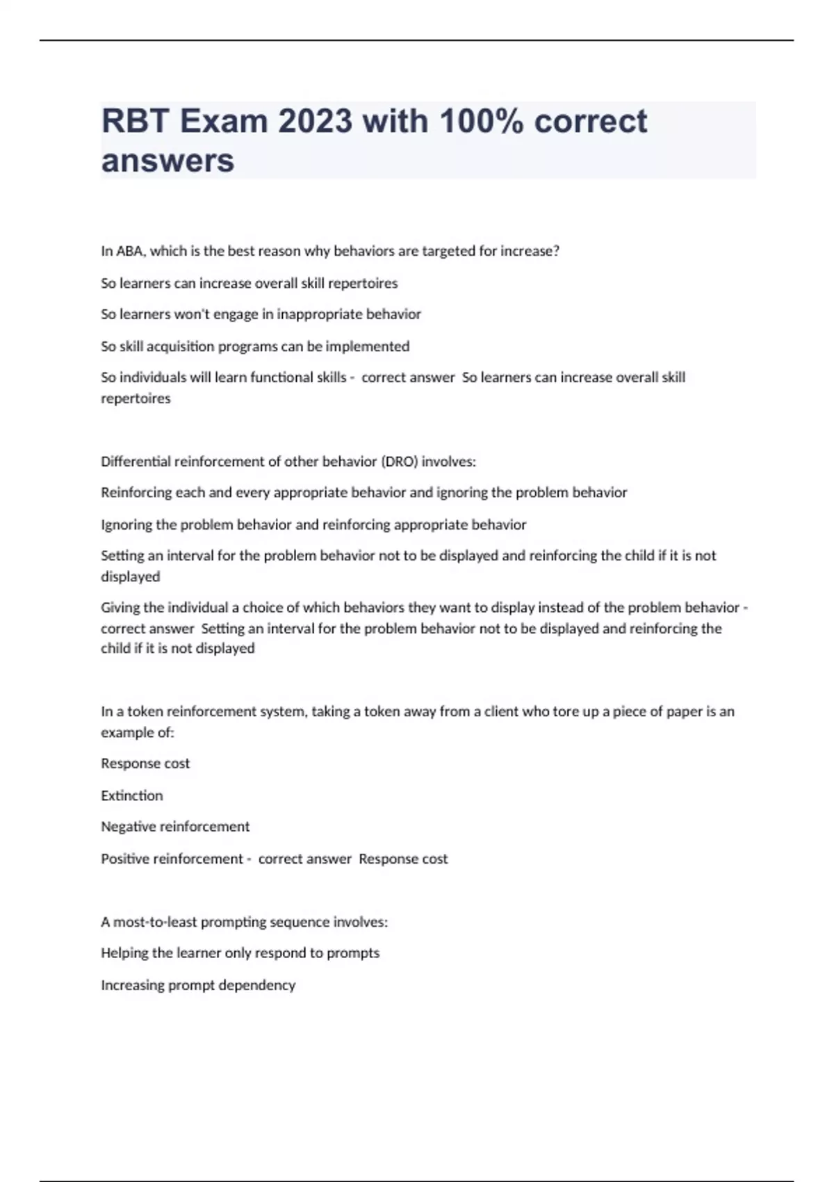 In ABA, which is the best reason why behaviors are targeted for increase? So learners can increase overall skill repertoires So learners won't engage in inappropriate behavior So skill acquisition programs can be implemented So individuals will learn functional skills - correct answer So learners can increase overall skill repertoires Differential reinforcement of other behavior (DRO) involves: Reinforcing each and every appropriate behavior and ignoring the problem behavior Ignoring the problem behavior and reinforcing appropriate behavior Setting an interval for the problem behavior not to be displayed and reinforcing the child if it is not displayed Giving the individual a choice of which behaviors they want to display instead of the problem behavior - correct answer Setting an interval for the problem behavior not to be displayed and reinforcing the child if it is not displayed In a token reinforcement system, taking a token away from a client who tore up a piece of paper is an example of: Response cost Extinction Negative reinforcement Positive reinforcement - correct answer Response cost A most-to-