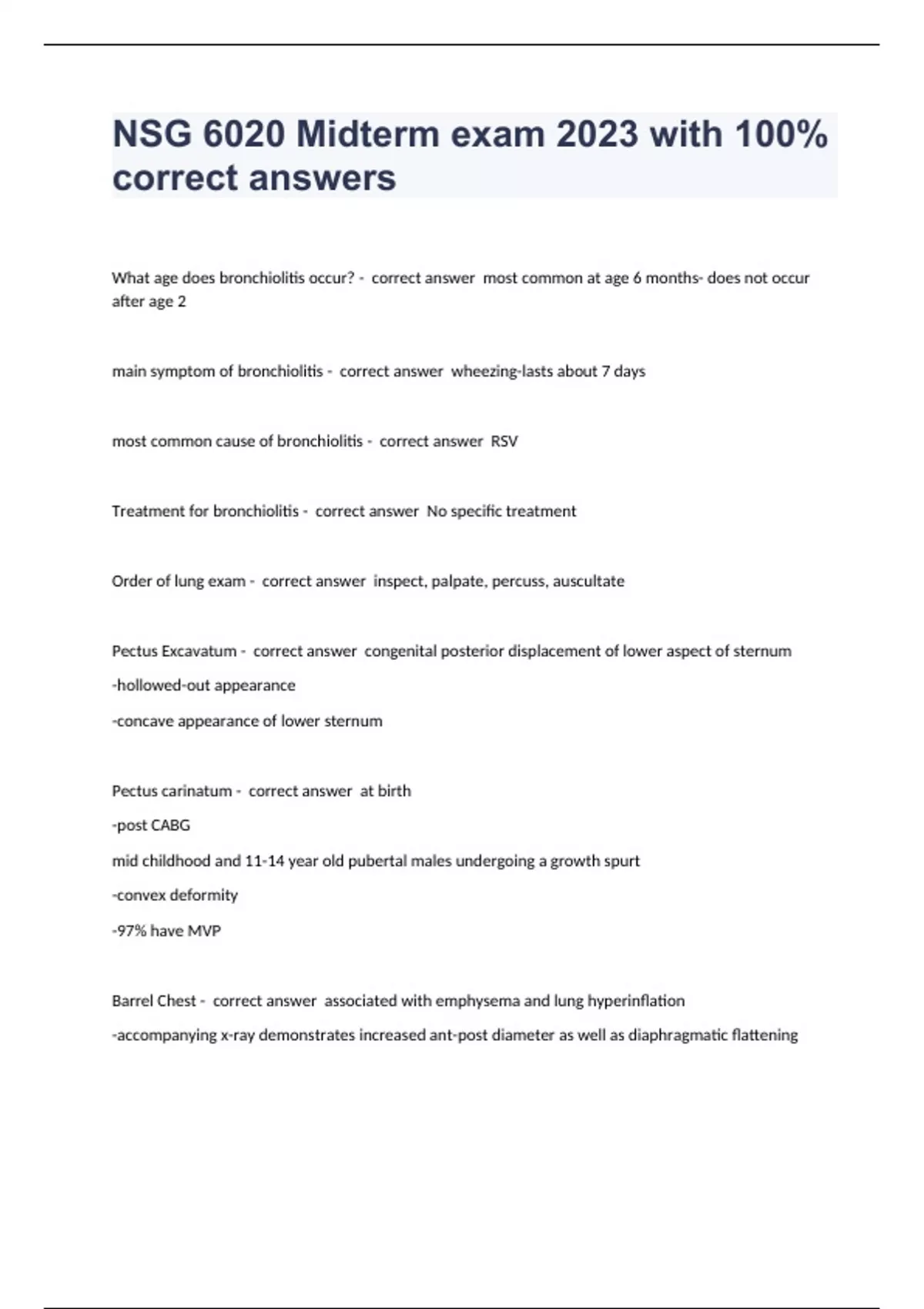 What age does bronchiolitis occur? - correct answer most common at age 6 months- does not occur after age 2 main symptom of bronchiolitis - correct answer wheezing-lasts about 7 days most common cause of bronchiolitis - correct answer RSV Treatment for bronchiolitis - correct answer No specific treatment Order of lung exam - correct answer inspect, palpate, percuss, auscultate Pectus Excavatum - correct answer congenital posterior displacement of lower aspect of sternum -hollowed-out appearance -concave appearance of lower sternum Pectus carinatum - correct answer at birth -post CABG mid childhood and 11-14 year old pubertal males undergoing a growth spurt -convex deformity -97% have MVP Barrel Chest - correct answer associated with emphysema and lung hyperinflation -accompanying x-ray demonstrates increased ant-post diameter as well as diaphragmatic flattening