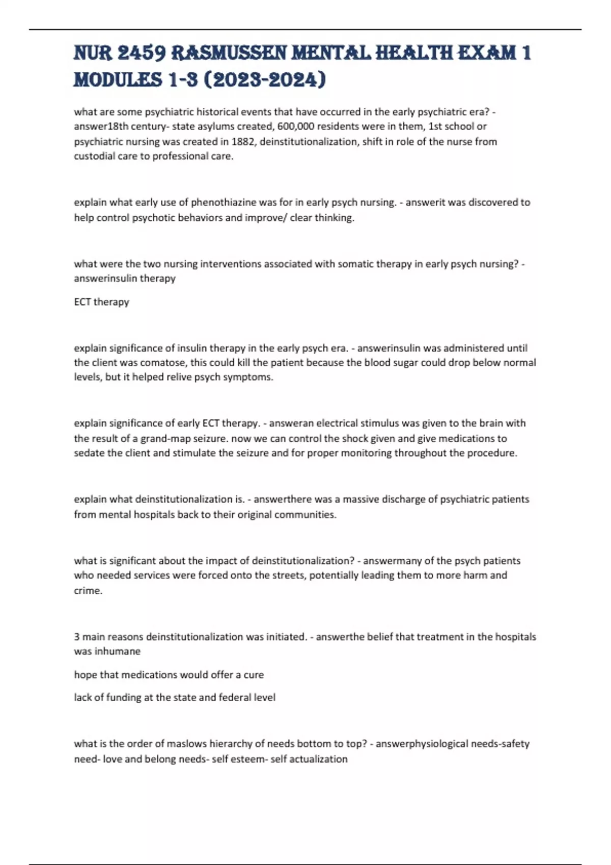 NUR 2459 Rasmussen Mental Health Exam 1 Modules 1-3 () what are some psychiatric historical events that have occurred in the early psychiatric era? - answer18th century- state asylums created, 600,000 residents were in them, 1st school or psychiatric nursing was created in 1882, deinstitutionalization, shift in role of the nurse from custodial care to professional care. explain what early use of phenothiazine was for in early psych nursing. - answerit was discovered to help control psychotic behaviors and improve/ clear thinking. what were the two nursing interventions associated with somatic therapy in early psych nursing? - answerinsulin therapy ECT therapy explain significance of insulin therapy in the early psych era. - answerinsulin was administered until the client was comatose, this could kill the patient because the blood sugar could drop below normal levels, but it helped relive psych symptoms. explain significance of early ECT therapy. - answeran electrical stimulus was given to the brain with the result of a grand-map seizure. now we can control the shock given and give medications to sedate the client and stimulate the seizure and for proper monitoring throughout the procedure. explain what deinstitutionalization is. - answerthere was a massive discharge of psychiatric patients from mental hospitals back to their original communities. what is significant about the impact of deinstitutionalization? - answermany of the psych patients who needed services