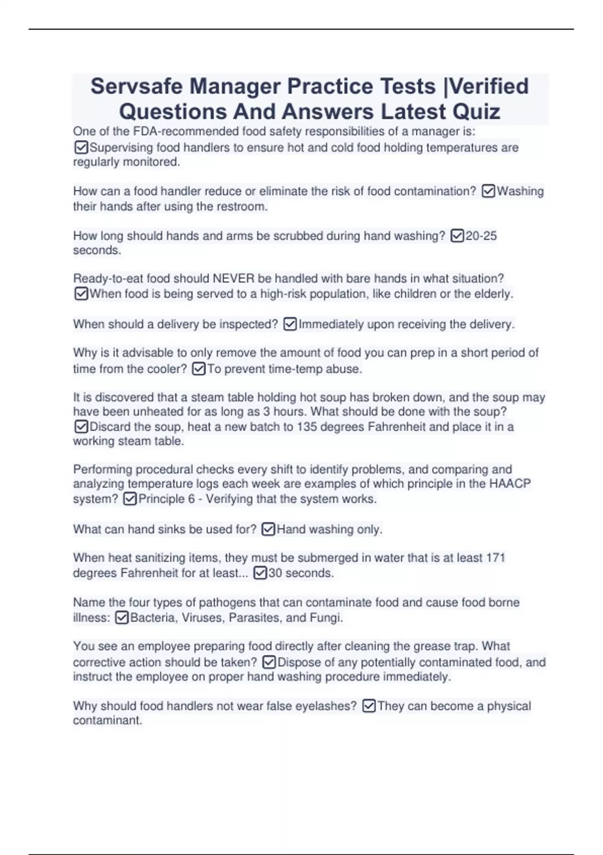 Servsafe Manager Practice Tests |Verified Questions And Answers Latest Quiz Servsafe Manager Practice Tests |Verified Questions And Answers Latest Quiz