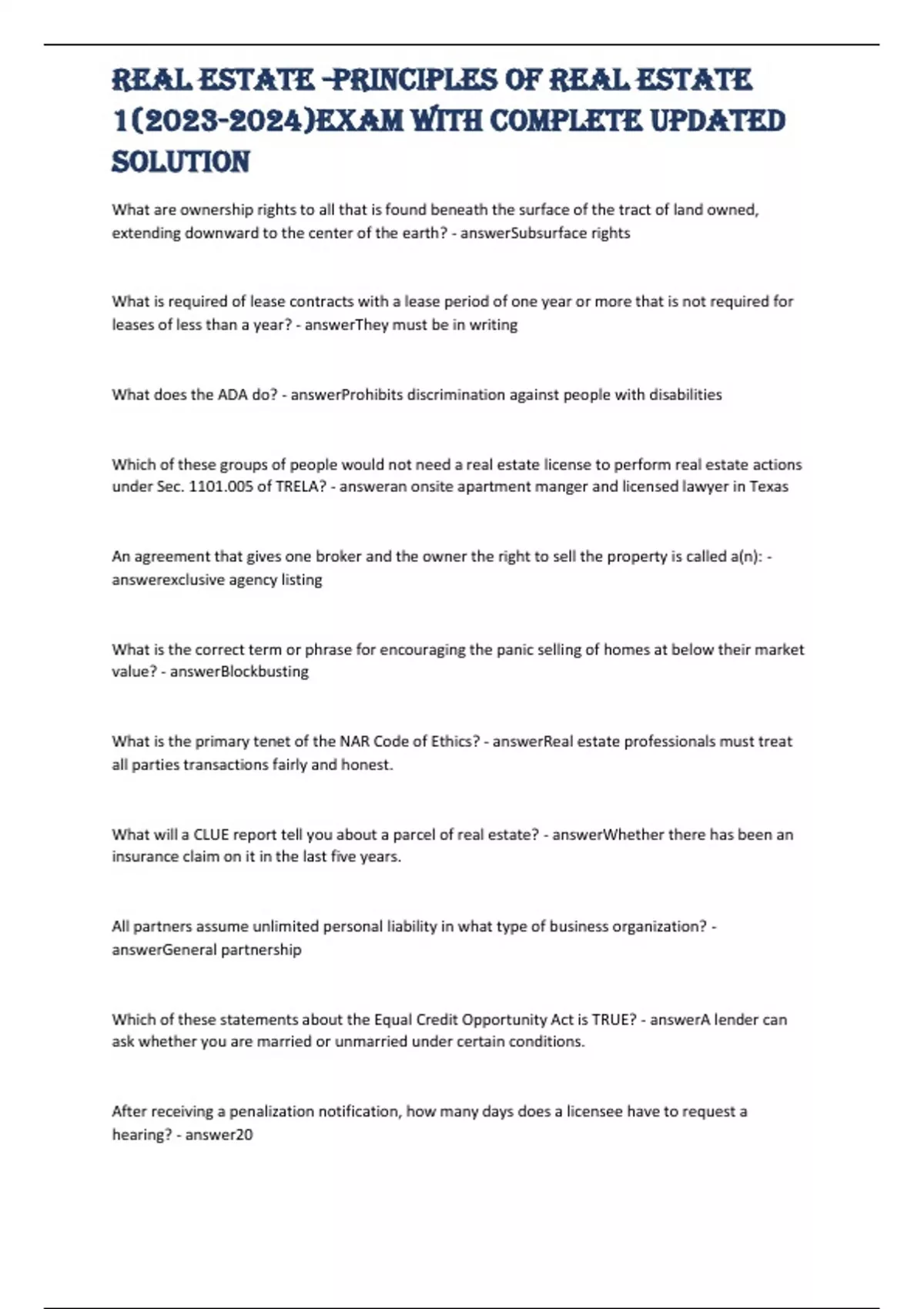 Real estate -principles of real estate 1()Exam with complete updated solution What are ownership rights to all that is found beneath the surface of the tract of land owned, extending downward to the center of the earth? - answerSubsurface rights What is required of lease contracts with a lease period of one year or more that is not required for leases of less than a year? - answerThey must be in writing What does the ADA do? - answerProhibits discrimination against people with disabilities Which of these groups of people would not need a real estate license to perform real estate actions under Sec. 1101.005 of TRELA? - answeran onsite apartment manger and licensed lawyer in Texas An agreement that gives one broker and the owner the right to sell the property is called a(n): - answerexclusive agency listing What is the correct term or phrase for encouraging the panic selling of homes at below their market value? - answerBlockbusting