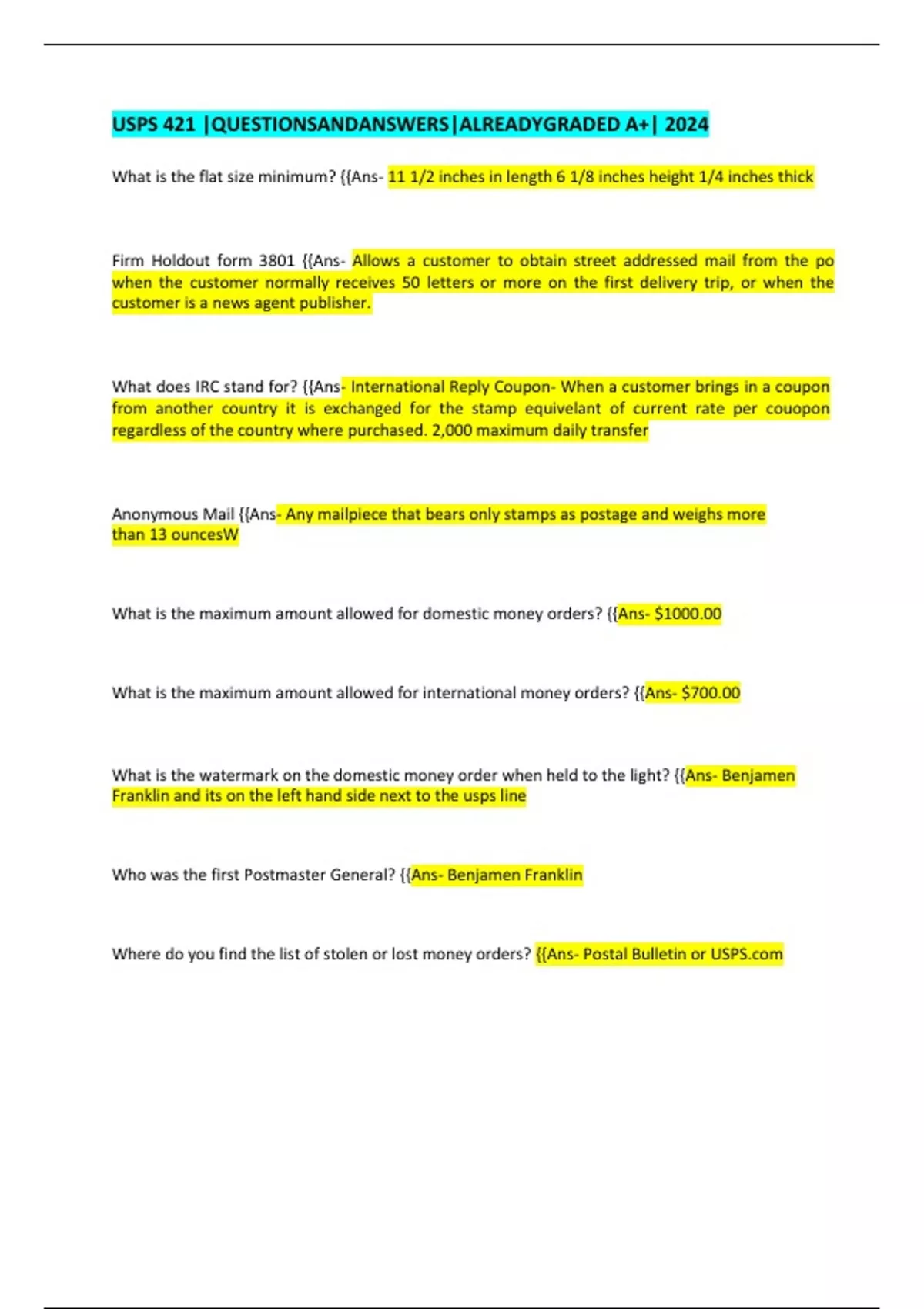 USPS 421 |QUESTIONSANDANSWERS|ALREADYGRADED A+| 2024 What is the flat size minimum? {{Ans- 11 1/2 inches in length 6 1/8 inches height 1/4 inches thick Firm Holdout form 3801 {{Ans- Allows a customer to obtain street addressed mail from the po when the customer normally receives 50 letters or more on the first delivery trip, or when the customer is a news agent publisher. What does IRC stand for? {{Ans- International Reply Coupon- When a customer brings in a coupon from another country it is exchanged for the stamp equivelant of current rate per couopon regardless of the country where purchased. 2,000 maximum daily transfer Anonymous Mail {{Ans- Any mailpiece that bears only stamps as postage and weighs more than 13 ouncesW What is the maximum amount allowed for domestic money orders? {{Ans- $1000.00 What is the maximum amount allowed for international money orders? {{Ans- $700.00 What is the watermark on the domestic money order when held to the light? {{Ans- Benjamen Franklin and its on the left hand side next to the usps line Who was the first Postmaster General? {{Ans- Benjamen Franklin Where do you find the list of stolen or lost money orders? {{Ans- Postal Bulletin or USPS.com