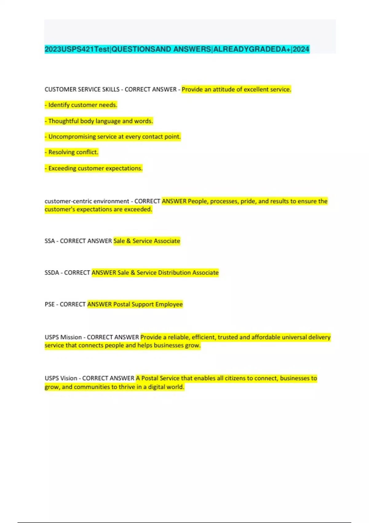 2023USPS421Test|QUESTIONSAND ANSWERS|ALREADYGRADEDA+|2024 CUSTOMER SERVICE SKILLS - CORRECT ANSWER - Provide an attitude of excellent service. - Identify customer needs. - Thoughtful body language and words. - Uncompromising service at every contact point. - Resolving conflict. - Exceeding customer expectations. customer-centric environment - CORRECT ANSWER People, processes, pride, and results to ensure the customer's expectations are exceeded. SSA - CORRECT ANSWER Sale & Service Associate SSDA - CORRECT ANSWER Sale & Service Distribution Associate PSE - CORRECT ANSWER Postal Support Employee USPS Mission - CORRECT ANSWER Provide a reliable, efficient, trusted and affordable universal delivery service that connects people and helps businesses grow. USPS Vision - CORRECT ANSWER A Postal Service that enables all citizens to connect, businesses to grow, and communities to thrive in a digital world. USPS is - CORRECT ANSWER Self-supporting, independent federal agency, and the only delivery service that reaches every address in the nation. USPS core set of enduring goals are to: - CORRECT ANSWER • Deliver High-Quality Services • Provide World Class Customer Experiences • Ensure a Safe Workplace and an Engaged Workforce Postal Inspectors - CORRECT ANSWER Primary law enforcing agency of the USPS, protecting the Postal Service, securing the nation's mail system, and ensuring public trust in the mail. Ensure Security and Sanctity of the Mail - CORRECT ANSWER You are mandated by federal law to preserve and protect all mail placed in your c