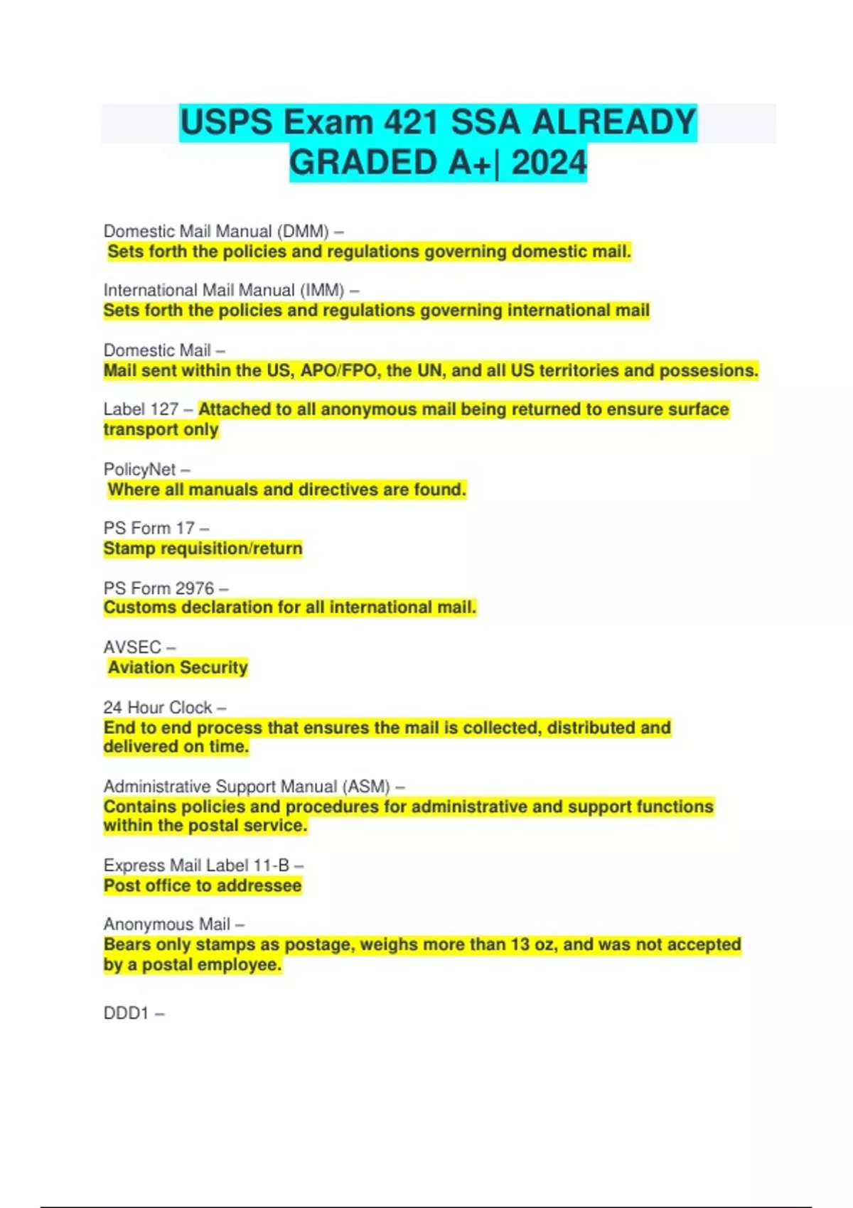 USPS Exam 421 SSA ALREADY GRADED A+| 2024 Domestic Mail Manual (DMM) – Sets forth the policies and regulations governing domestic mail. International Mail Manual (IMM) – Sets forth the policies and regulations governing international mail Domestic Mail – Mail sent within the US, APO/FPO, the UN, and all US territories and possesions. Label 127 – Attached to all anonymous mail being returned to ensure surface transport only PolicyNet – Where all manuals and directives are found. PS Form 17 – Stamp requisition/return PS Form 2976 – Customs declaration for all international mail. AVSEC – Aviation Security 24 Hour Clock – End to end process that ensures the mail is collected, distributed and delivered on time. Administrative Support Manual (ASM) – Contains policies and procedures for administrative and support functions within the postal service. Express Mail Label 11-B – Post office to addressee Anonymous Mail – Bears only stamps as postage, weighs more than 13 oz, and was not accepted by a postal employee. DDD1 –
