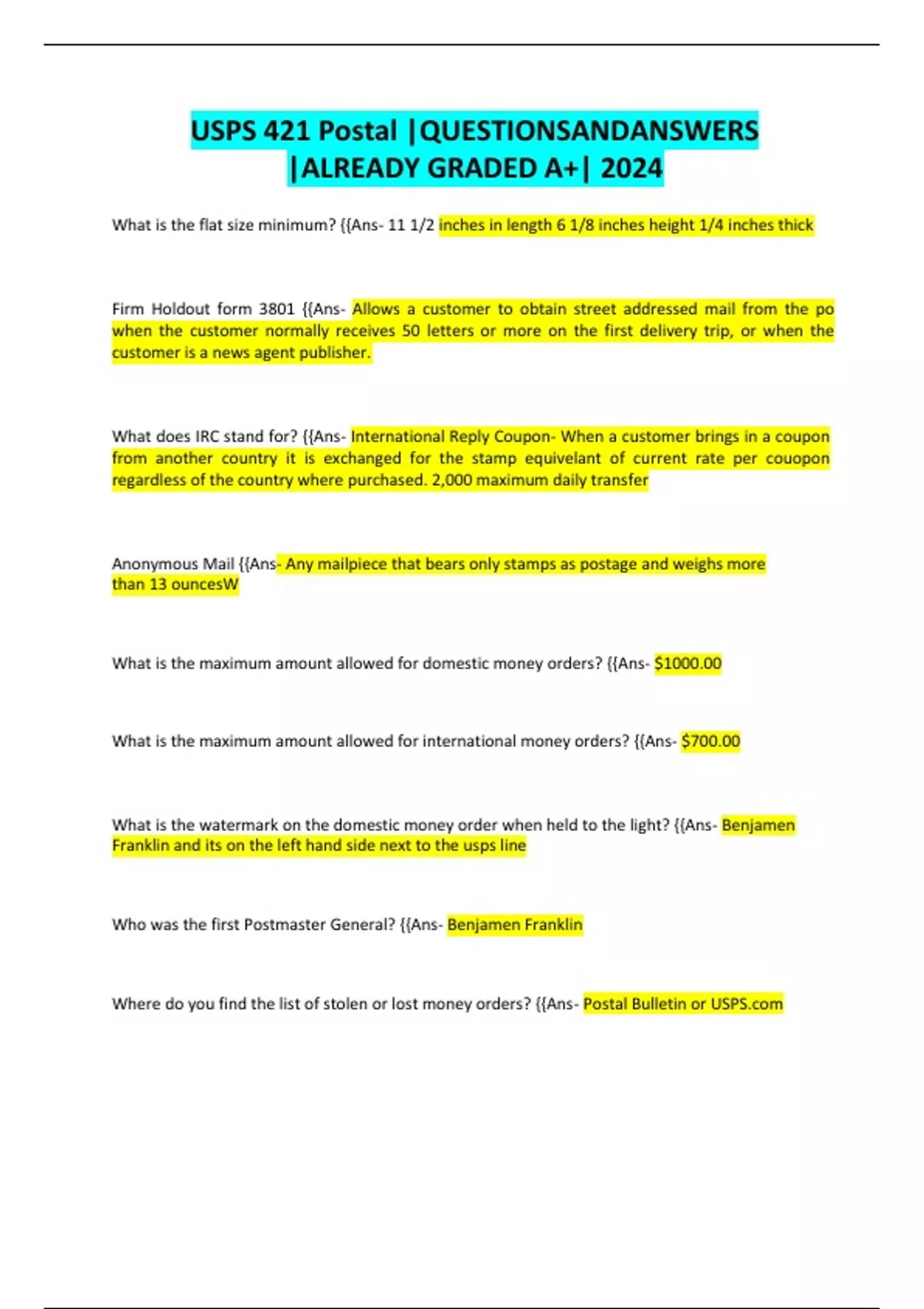 USPS 421 Postal |QUESTIONSANDANSWERS |ALREADY GRADED A+| 2024 What is the flat size minimum? {{Ans- 11 1/2 inches in length 6 1/8 inches height 1/4 inches thick Firm Holdout form 3801 {{Ans- Allows a customer to obtain street addressed mail from the po when the customer normally receives 50 letters or more on the first delivery trip, or when the customer is a news agent publisher. What does IRC stand for? {{Ans- International Reply Coupon- When a customer brings in a coupon from another country it is exchanged for the stamp equivelant of current rate per couopon regardless of the country where purchased. 2,000 maximum daily transfer Anonymous Mail {{Ans- Any mailpiece that bears only stamps as postage and weighs more than 13 ouncesW What is the maximum amount allowed for domestic money orders? {{Ans- $1000.00 What is the maximum amount allowed for international money orders? {{Ans- $700.00 What is the watermark on the domestic money order when held to the light? {{Ans- Benjamen Franklin and its on the left hand side next to the usps line Who was the first Postmaster General? {{Ans- Benjamen Franklin Where do you find the list of stolen or lost money orders? {{Ans- Postal Bulletin or USPS.com