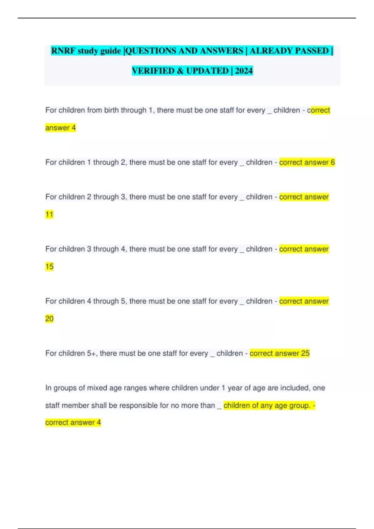RNRF study guide |QUESTIONS AND ANSWERS | ALREADY PASSED | VERIFIED & UPDATED | 2024 For children from birth through 1, there must be one staff for every _ children - correct answer 4 For children 1 through 2, there must be one staff for every _ children - correct answer 6 For children 2 through 3, there must be one staff for every _ children - correct answer 11 For children 3 through 4, there must be one staff for every _ children - correct answer 15 For children 4 through 5, there must be one staff for every _ children - correct answer 20 For children 5+, there must be one staff for every _ children - correct answer 25 In groups of mixed age ranges where children under 1 year of age are included, one staff member shall be responsible for no more than _ children of any age group. - correct answer 4